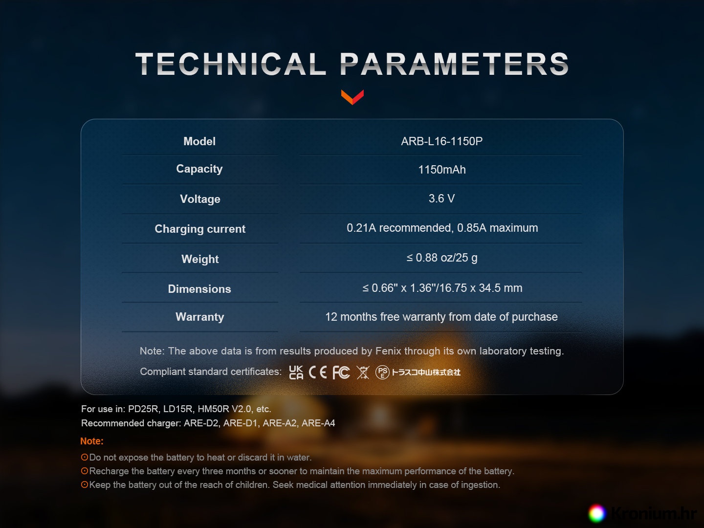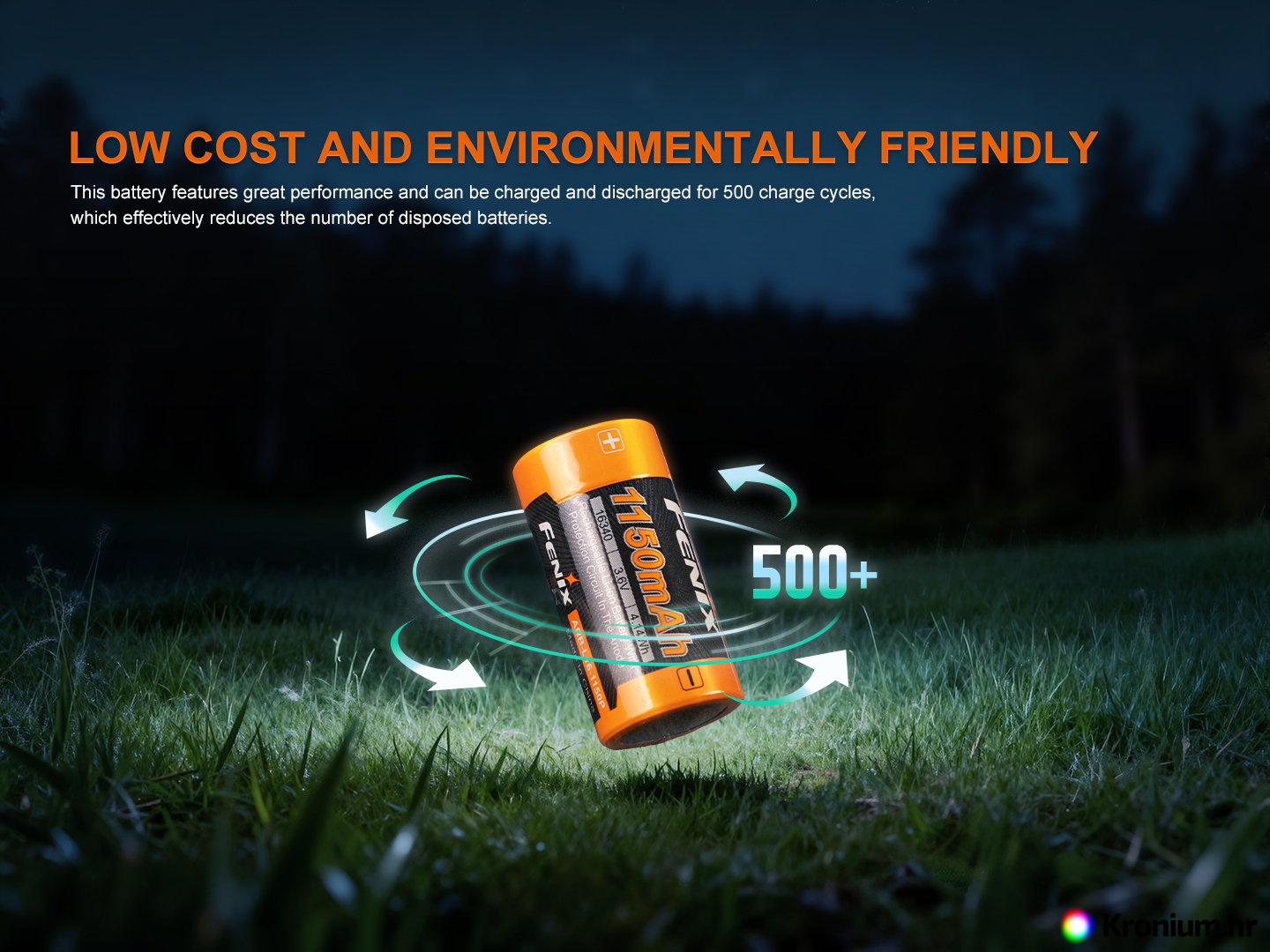 Vrhunska punjiva Li-ion baterija Fenix ARB-L16-1150P (veličina RCR123A / 16340) dolazi s iznimno velikim kapacitetom od 1150 mAh. Zahvaljujući tome osigurat će znatno duže trajanje vaših uređaja. Idealan je izbor za ručne i naglavne svjetiljke s visokom potrošnjom struje, kao što su Fenix E18R V2.0, Fenix HM50R V2.0, Fenix HM51R V3.0, Fenix Vitae ili Fenix PD25R. Ova baterija se može puniti izravno u punjivim svjetiljkama ili u vanjskim punjačima. Zahvaljujući modernoj Li-ion tehnologiji nema memorijski efekt i ima minimalno samopražnjenje, stoga je uvijek spremna za uporabu.