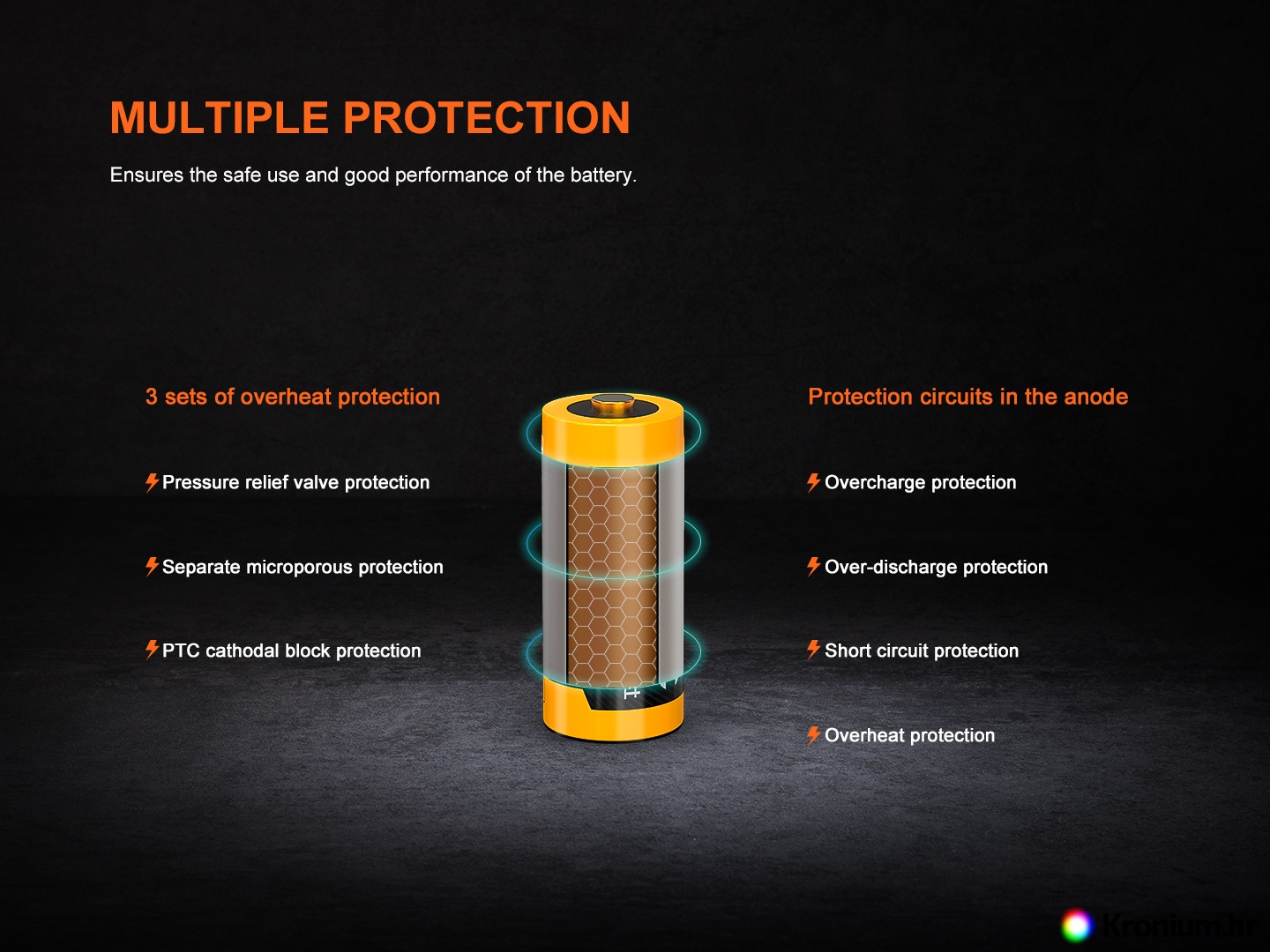 Zaštita baterije može se podijeliti u dva područja. U prvom se dodaju elektronički sklopovi koji sprječavaju prekomjerno punjenje ćelije (što je kod klasičnih li-ionskih baterija opasnost od eksplozije) ili, naprotiv, njezino prekomjerno pražnjenje (baterija se tada ne bi mogla ponovno napuniti). Osim toga, ovi krugovi štite bateriju od kratkog spoja ili velike potrošnje struje, što bi moglo oštetiti bateriju. Ako elektronika baterije ocijeni da su dosegnute granične vrijednosti, odspaja ćeliju. U drugom je zaštita od pregrijavanja (PTC toplinska zaštita) i poseban protueksplozijski ventil. Za razliku od drugih ventila koji se koriste u li-ion baterijama, ovaj, kada tlak plina u ćeliji prijeđe određenu granicu, odvaja elektrode unutar baterije i time de-facto prekida egzotermnu reakciju i otpušta višak tlaka plina izvan baterije. Zahvaljujući kombinaciji elektroničke i mehaničke (temperatura i tlak) zaštite, Fenix baterije su među najsigurnijim dostupnim Li-ion baterijama.