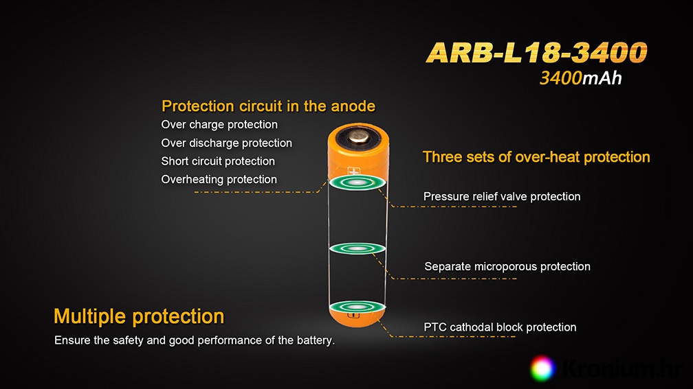 Vrhunske baterije na punjenje Fenix 18650 3400 mAh (ARB-L18-3400) sa zaštitnom elektronikom (protected) su temeljene na vrhunskim člancima NCR18650GA od kompanije Panasonic/Sanyo s poboljšanom tehnologijom LiNiCoO2, koja donosi veću sigurnost i dulje vrijeme trajanja. Li-ion baterije na punjenje se ističu vrlo visokim kapacitetom, ne koriste efekt pamćenja niti se samovoljno isprazne. Li-ion u veličini 18650 su najboljim izborom glede očuvanja energije, te s obzirom na dimenzije i težinu baterije.