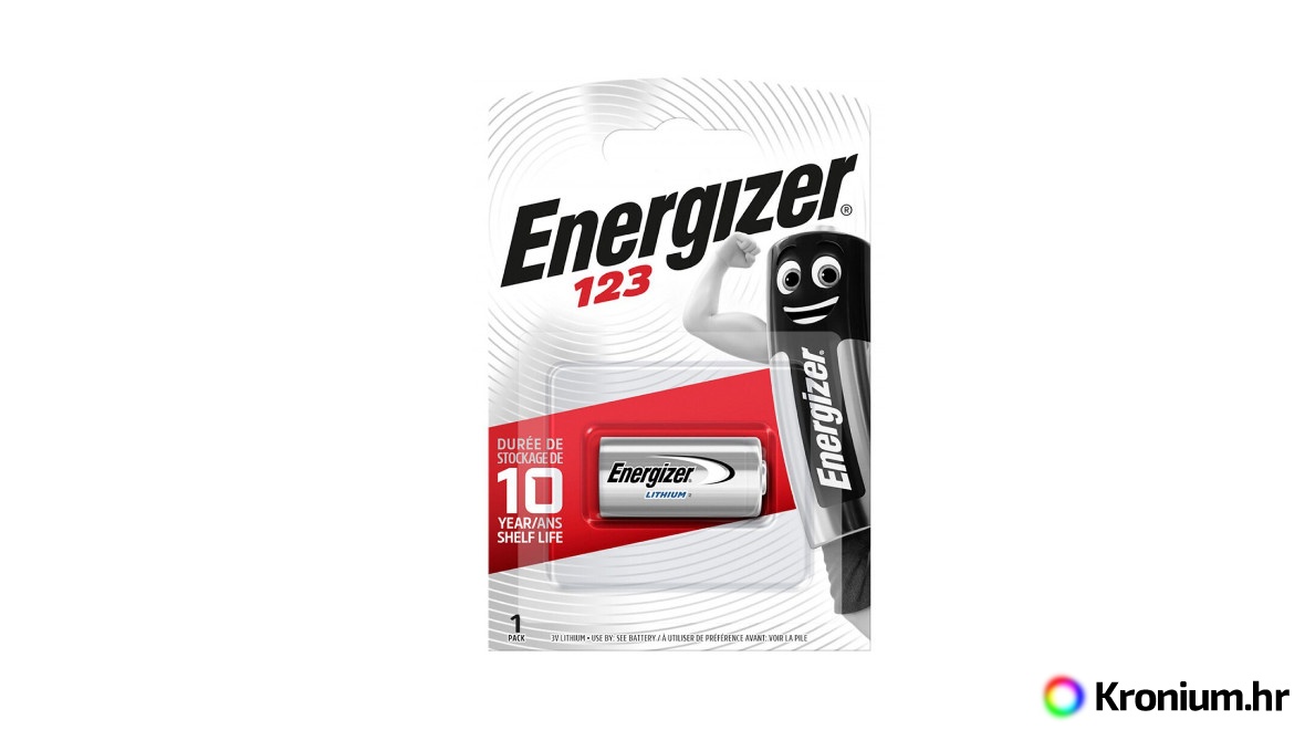 Jedan komad jednokratne litijske baterije Energizer CR123 (CR123A, DL123, DL123A, CR17345, EL123AP, foto baterija). Odlikuje se jednim od najvećih kapaciteta na tržištu, ekstremnom izdržljivošću i otpornošću na niske temperature.