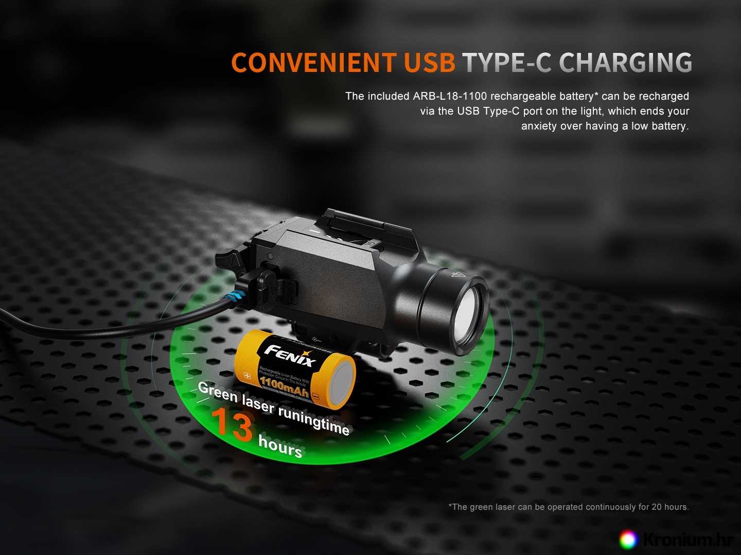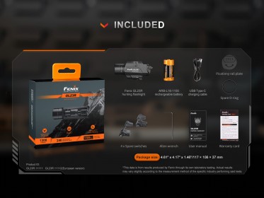 - Paket uključuje bateriju Fenix ARB-L18-1100, dva seta rezervnih ručica za upravljanje (treći set je već instaliran na svjetiljku iz produkcije), USB-C kabel za punjenje, imbus ključ za podešavanje smjera laserskog svjetla, montažnu ploču na Picatinny šinu (GLOCK ploča već je unaprijed instalirana na svjetiljku iz proizvodnje), rezervni o-prsten i upute.