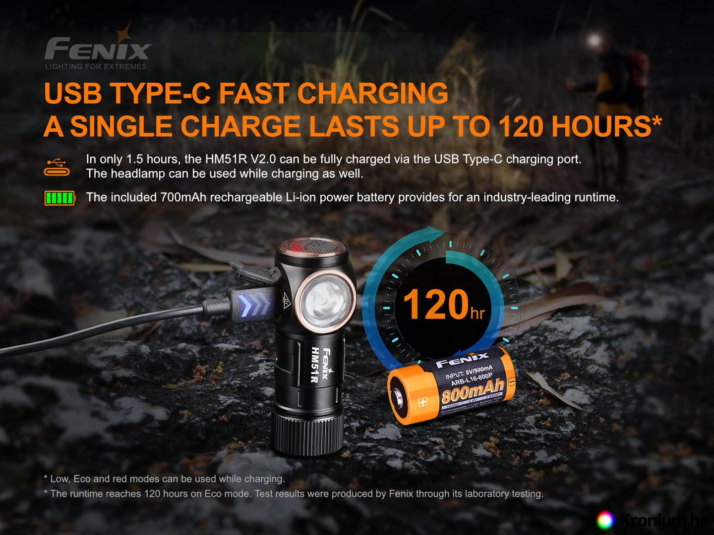 Druga generacija vrlo omiljene naglavne svjetiljke na punjenje Fenix HM51R Ruby V2.0 nudi svjetlosni tok do 700 lumena (ANSI) neutralnog bijeloga svjetla (4500 K) s dosegom do 134 metara i uz to ima crvene LED. Puni je baterija na napajanje tipa RCR123A (dio pakiranja), koji se puni unutar svjetiljke kroz moderan USB-C konektor. Alternativno je moguće koristiti i jednokratnu litijsku bateriju CR123A (ograničeno opterećenje snage na 150 lumena). U gumbiću za upravljanje je ugrađena indikacijska LED dioda i zahvaljujući njoj ćete znati kada treba napuniti bateriju. Završetak svjetiljke ima magnet, pa ju možete postaviti na bilo što željezno. HM51R disponira sa devet režima svjetljenja koji omogućavaju izbor između visokog opterećenja snage i duge izdržljivosti (do 120 sati). Svjetiljka se napaja konstantnom strujom s garancijom stalnog svjetlosnog opterećenja i kad se snižava napon u baterijama (u polaganom pražnjenju).