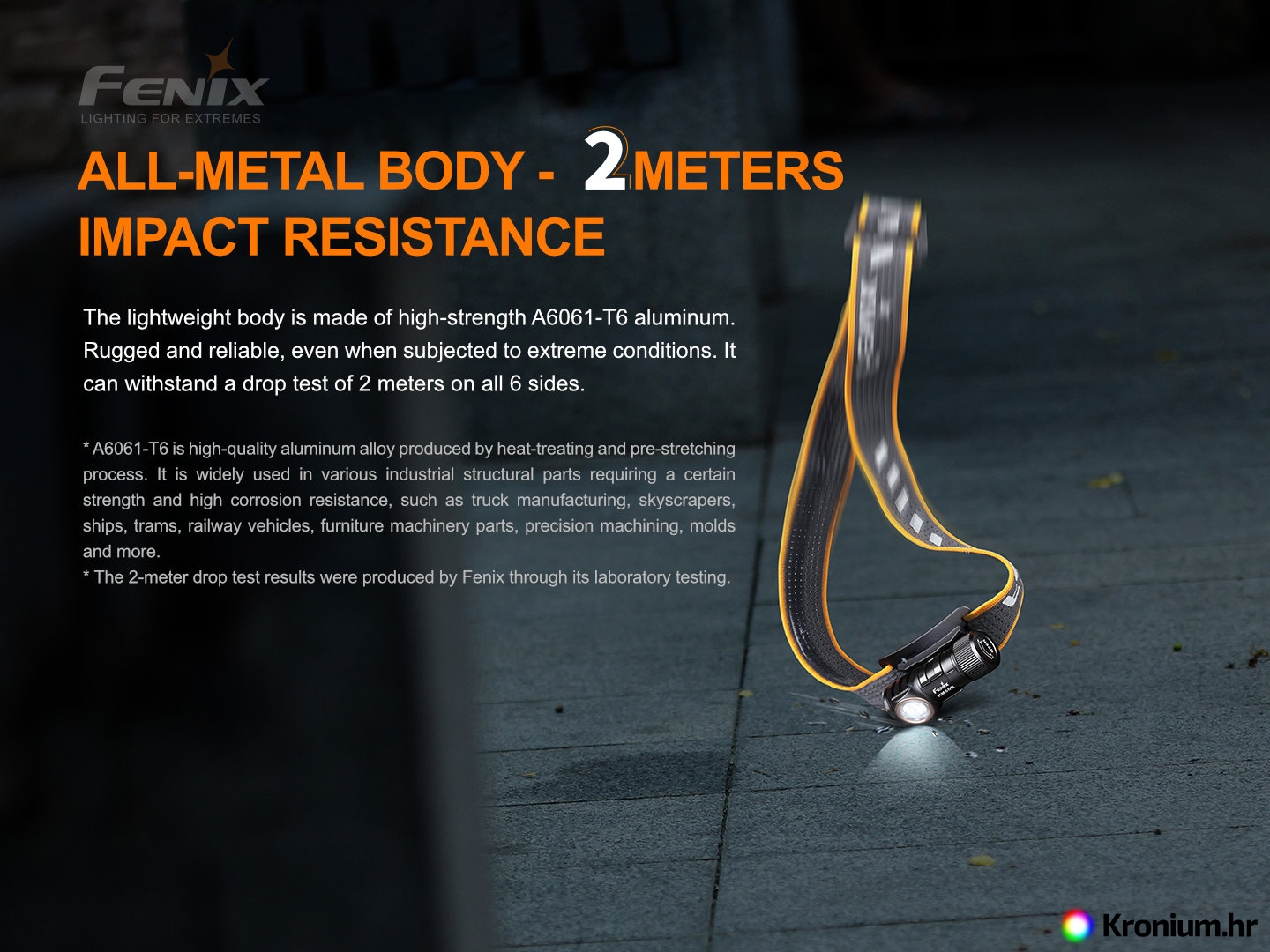 Metalna konstrukcija osigurava visoku otpornost, optimalno hlađenje i istovremeno je potpuno vodonepropusna prema standardu IP68 do dubine 2 metra pod vodom. Njena praktičnost se povećava i time što se može izvaditi iz držača glave i koristiti se poput malene džepne svjetiljke. Štoviše, čeona svjetiljka ima i čeličnu sponu koju možete skinuti te ju zakvačiti za džep ili remen. Naglavna svjetiljka Fenix HM51R V2.0 je idealnim partnerom za raznovrsne sportske aktivnosti, izlete u prirodu, za domaćinstvo i posao.