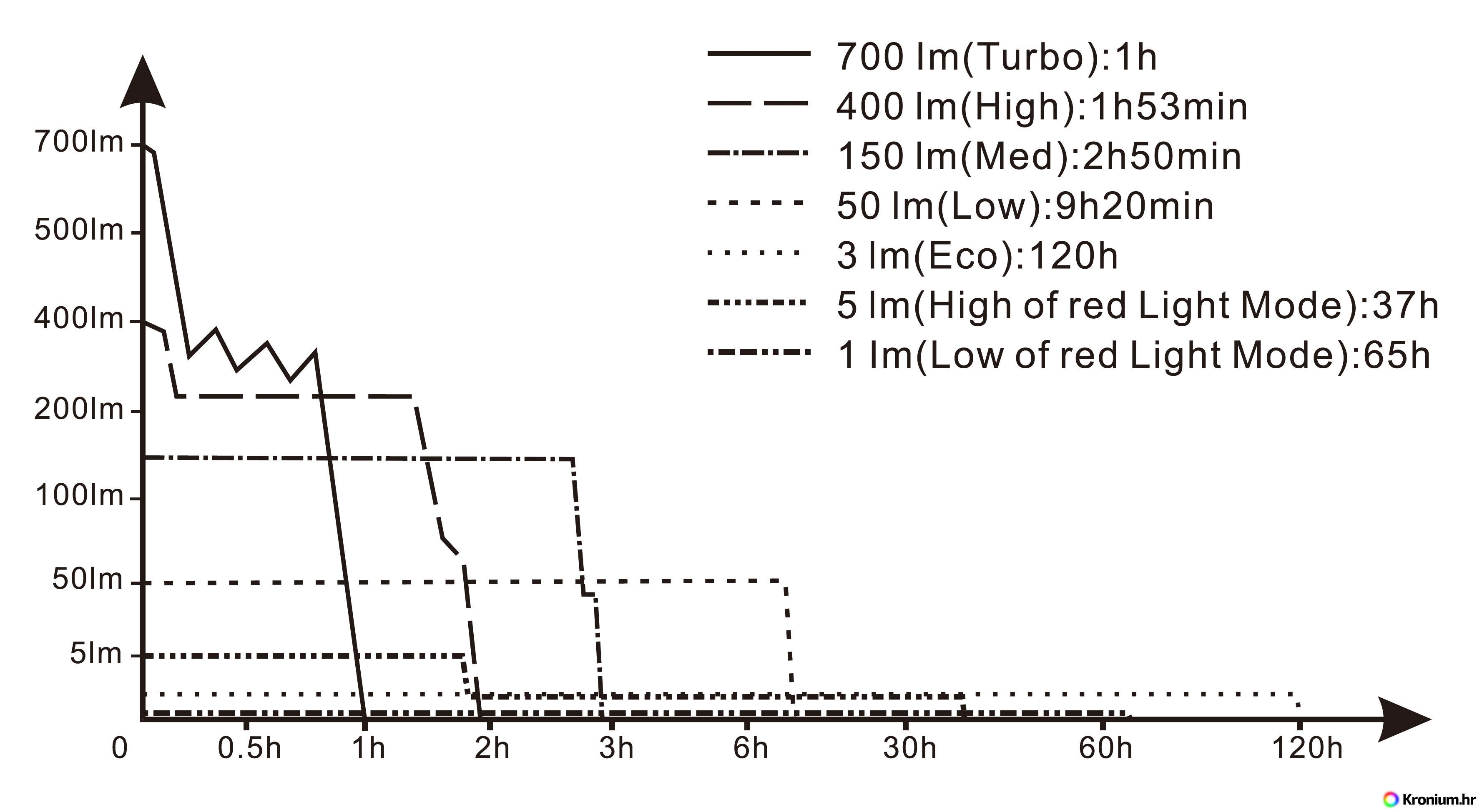 - Pet načina bijelog svjetla: 700 lumena (1 sat) -> 400 lumena (1,8 sati) -> 150 lumena (2,8 sati) -> 50 lumena (9,3 sata) -> 3 lumena (120 sati)