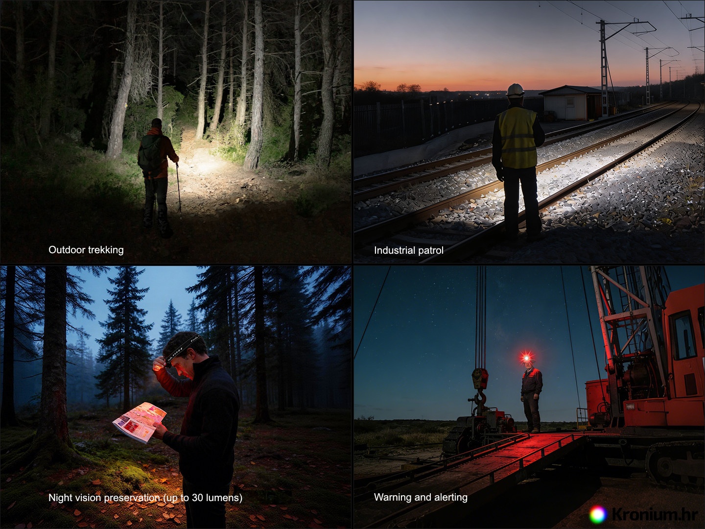 - Četiri načina rada crvenog svjetla: 30 lumena (6,5 sati) -> 10 lumena (13,5 sati) -> 1 lumen (108 sati) -> crveno treperenje 10 lumena (/).