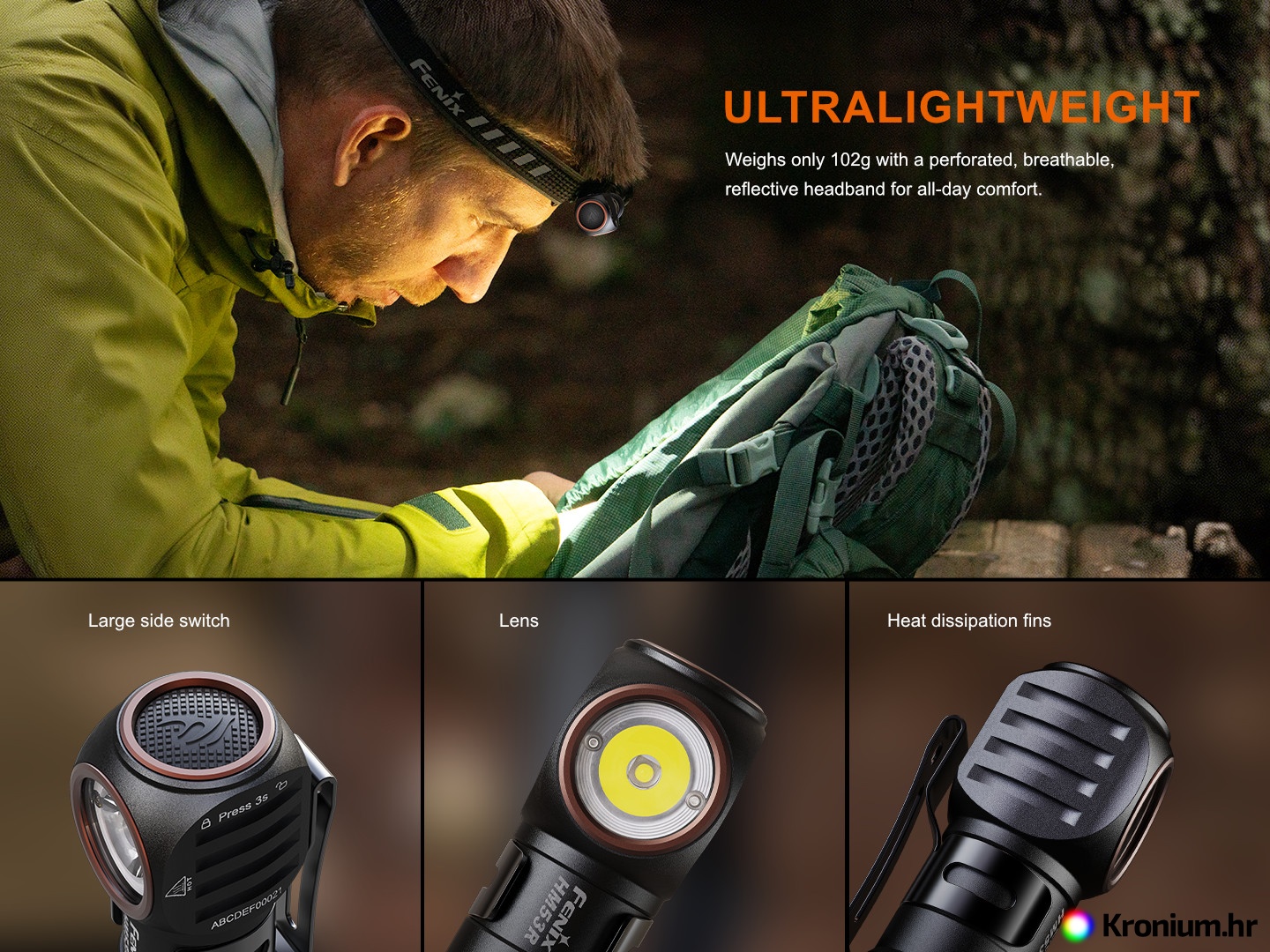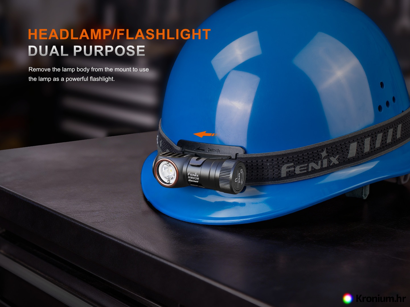 - Udobna perforirana traka. Kod sivo-narančaste verzije opremljena je reflektirajućim elementima, kod crne verzije svjetiljke je bez reflektirajućim elemenata.