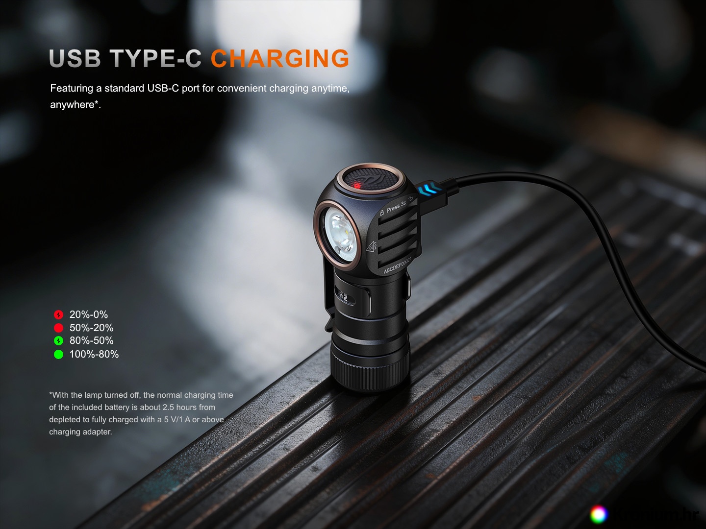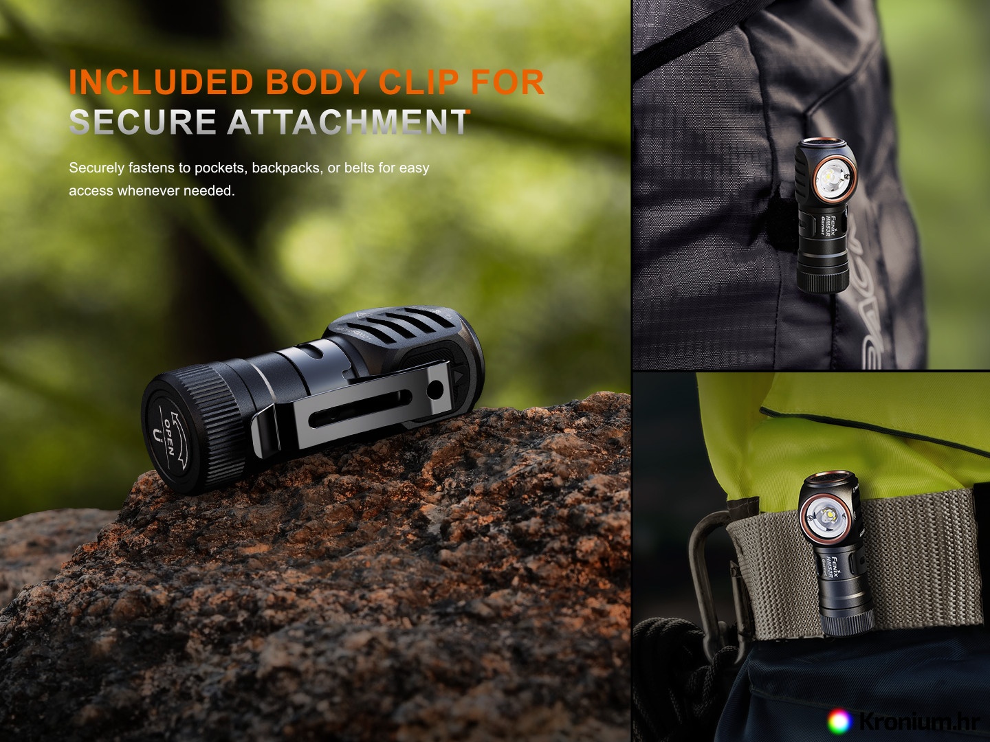 Svjetiljku napaja priložena punjiva baterija tipa 18350 kapaciteta 1600 mAh, koja se puni izravno u tijelu svjetiljke preko modernog USB-C konektora. U upravljačkoj tipki nalazi se praktičan LED indikator, zahvaljujući kojem uvijek točno znate kada je vrijeme za punjenje energije. U slučaju nužde, za napajanje se može koristiti i jednokratna litijeva baterija CR123A (s maksimalnom snagom ograničenom na 150 lumena). Vrhunska elektronika s digitalnom regulacijom osigurava konstantnu snagu svjetlosti čak i uz postupno pražnjenje baterije. Uz to, u štedljivom načinu rada može svijetliti do 250 sati u komadu.