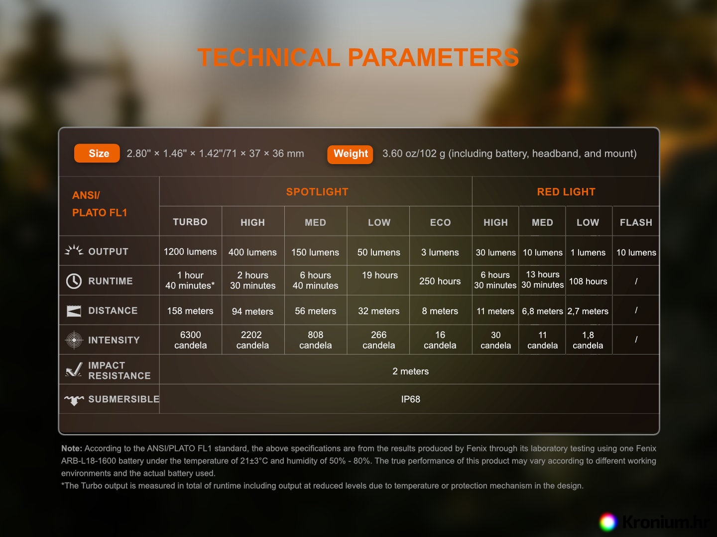 Svi parametri svjetiljke (svjetlosni tok, vrijeme rada na baterije, vodootpornost, domet i otpornost na udarce) izmjereni su u skladu sa standardom ANSI/NEMA FL 1-2009.