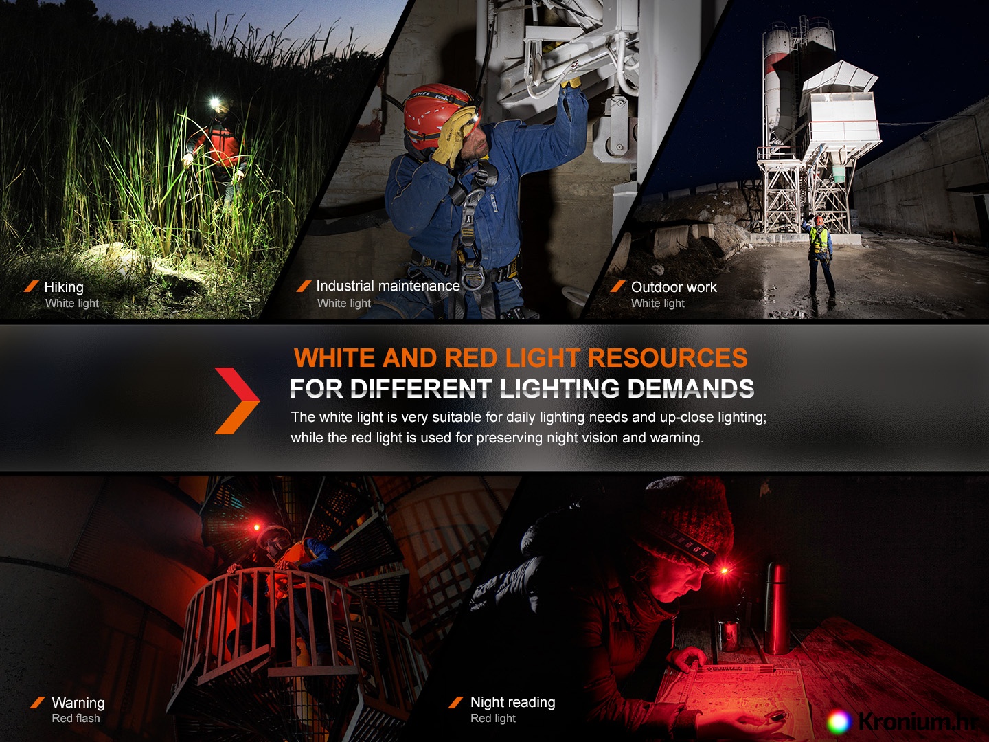 - Tri režima crvenog svjetla: 1 lumen (400 sati) -> 10 lumena (40 sati) -> crveno treperenje 10 lumena (80 sati)