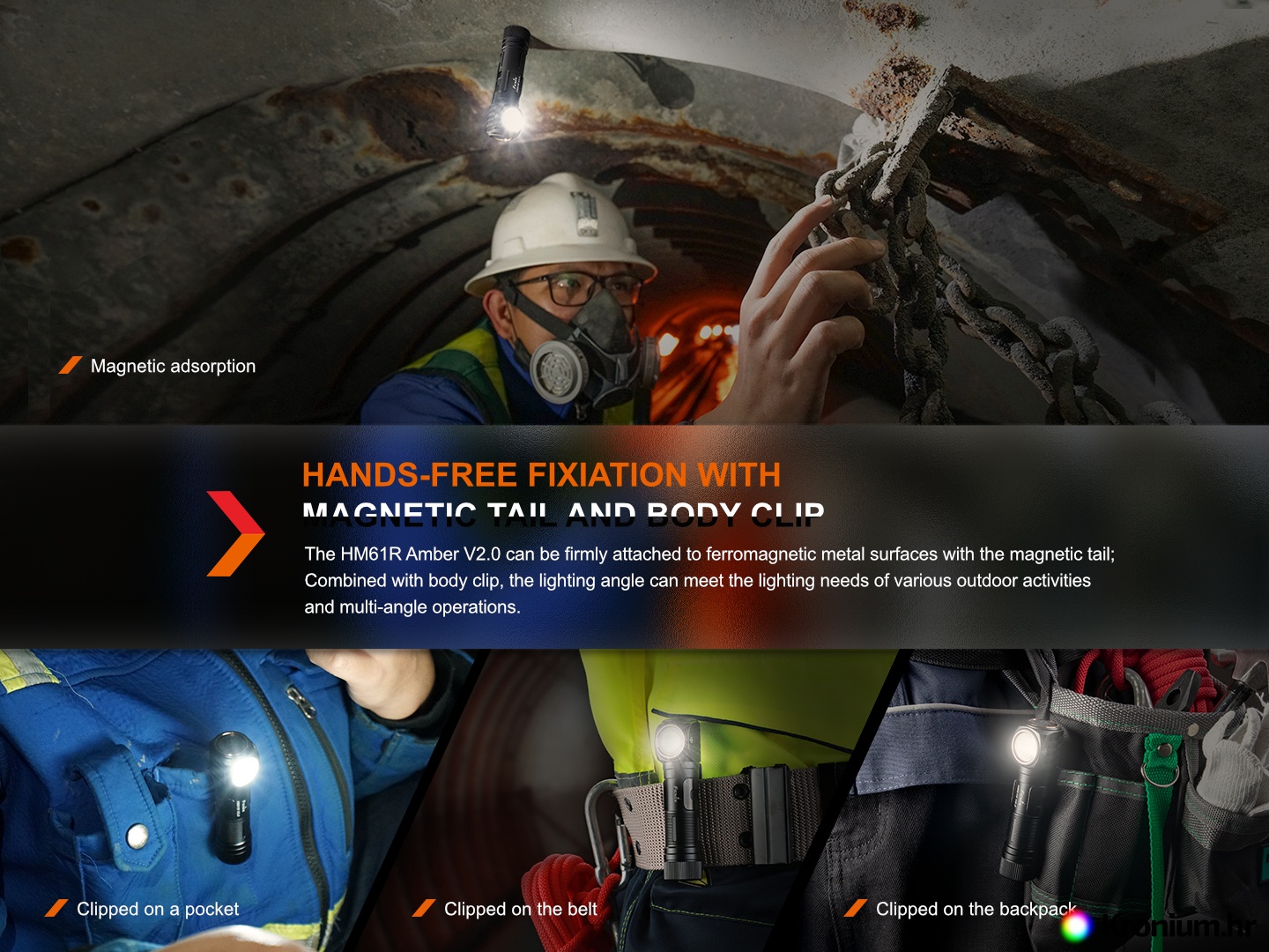 Nova generacija naglavne svjetiljke na punjenje Fenix HM61R Amber V2.0 nudi svjetlosni tok do 1.600 lumena (ANSI) neutralnog bijelog svjetla (4500 K), s dosegom do 162 metra. Opremljena je i crvenima LED Everlight. Napaja je jedna Li-ion baterija na punjenje tipa 18650 kapaciteta 3.400 mAh koja se puni direktno u svjetiljki preko magnetskog konektora, a u nuždi je moguće za napajanje koristiti i jednokratne litijske baterije CR123A. Baterija ima ugrađeni USB-C konektor, te je moguće jednostavno ju puniti i van čeone svjetiljke, bez magnetskog kabela. U gumbu za upravljanje ugrađena je indikacijska LED zahvaljujući kojoj ćete uvijek znati, kada bateriju treba napuniti. Završetak svjetiljke je magnetski, te ju možete lako postaviti na bilo što od metala. HM61R Amber V2.0 disponira s osam raznih režima svjetljenja koji omogućavaju izbor između visoke snage opterećenja ili dužeg vremena trajanja (do 400 sati). Svjetiljka je napajana digitalno kontroliranom konstantnom strujom za osiguranje stalne svjetlosne snage opterećenja i kada se smanjuje napon u baterijama (dok se polagano prazne).