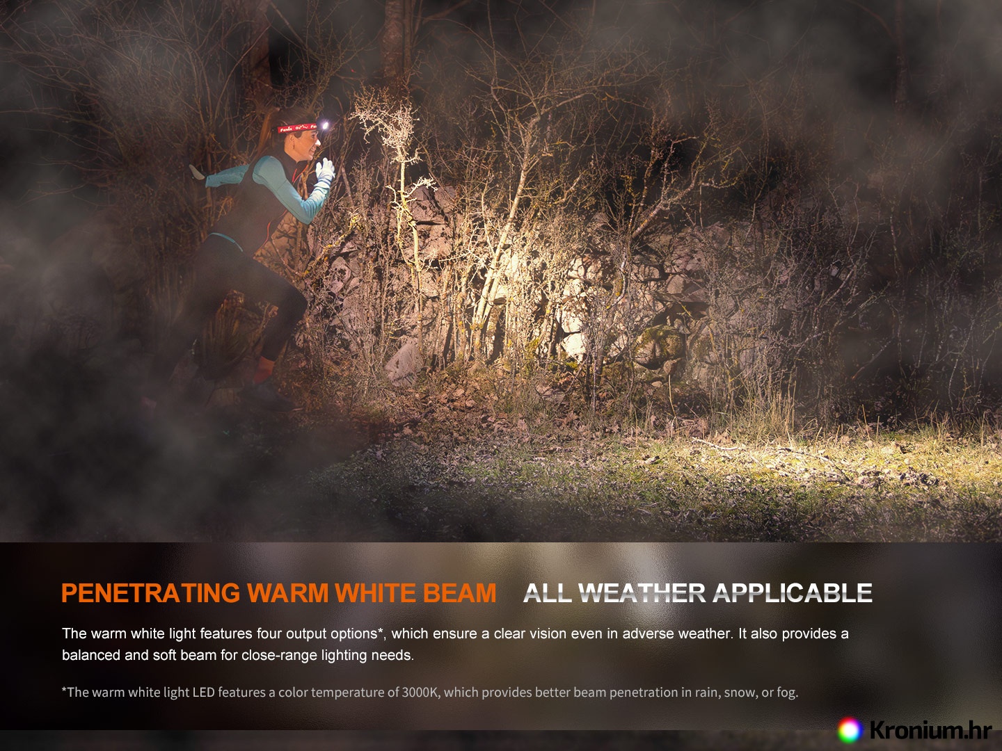 Glavni reflektor nudi 3 načina osvjetljenja i maksimalnu snagu lumena do 1600 lumena, drugi reflektor ima maksimalnu snagu od 800 lumena te možete birati između četiri načina osvjetljenja. Prednja svjetiljka također ima SOS način rada i integriranu zviždaljku na remenu za hitne situacije. Napajanje osigurava jedna Li-Ionska baterija tipa 18650 kapaciteta 3400 mAh, koja je uključena u paket, a puni se preko modernog USB-C konektora izravno u čeonoj svjetiljci. U slučaju nužde, svjetiljka se također može napajati s dvije jednokratne CR123A baterije.