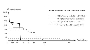 - Širokosnopni reflektor snage 3400 mAh: 1000 lumena (1,8 sati) - 400 lumena (4 sata) - 150 lumena (8 sati) - 5 lumena (100 sati).