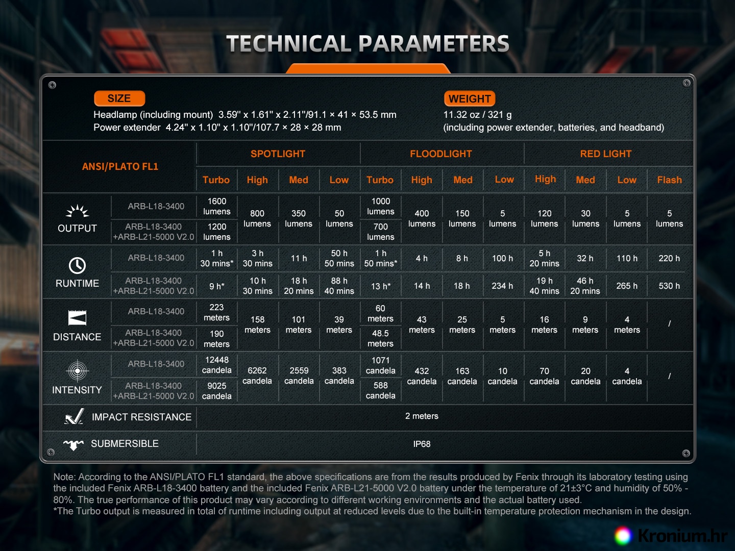 Svi parametri čeone svjetiljke (jačina lumena, trajanje baterije, vodootpornost, domet i otpornost na udarce) mjereni su u skladu s ANSI/NEMA FL 1-2009.