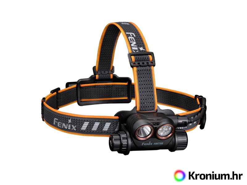 Fenix HM75R punjiva čeona svjetiljka, ima dva svjetlosna snopa snage do 1600 lumena i snažno crveno svjetlo snage do 120 lumena. Reflektor dugog dometa s visokoučinkovitim LED Luminus SST-40 svjetli fokusiranim svjetlosnim snopom dometa do 223 metra, a reflektor s visokoučinkovitim LED Luminus SST-20 ima vrlo širok i gladak svjetlosni snop s dometom od 60 metara. Snaga fokusiranog reflektora je do 1600 lumena, širokosnopni reflektor nudi maksimalnu snagu od 1000 lumena i neutralnu toplinu svjetla. Svjetlo iz oba reflektora ne može se kombinirati, ali možete jednostavno prebacivati između njih pomoću kotačića na bočnoj strani naglavne svjetiljke.
