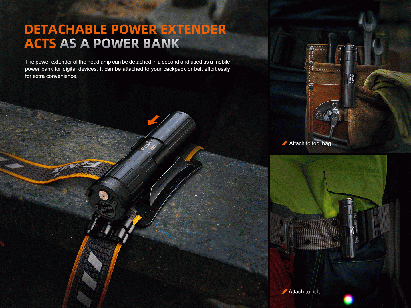 Napomena: naglavna svjetiljka može se koristiti u svim načinima dok se puni s 9 V USB izvorom. Maksimalna snaga fokusiranog reflektora bit će ograničena na 1200 lumena, a širokosnopnog reflektora na 700 lumena. Dok se puni s 5 V USB napajanjem, prednja svjetiljka se može koristiti samo u dva najslabija načina rada bilo kojeg reflektora. Svjetlo zatreperi nekoliko puta kada se prvi put uključi nakon priključivanja USB napajanja kako bi označilo korišteni napon punjenja. Dva bljeska označavaju punjenje s 5 V, a četiri treptaja označavaju punjenje s 9 V. Kada se napaja iz USB izvora, svjetiljka se može koristiti bez baterije unutra. U svjetiljci punite samo originalne Fenix ARB-L18 baterije.