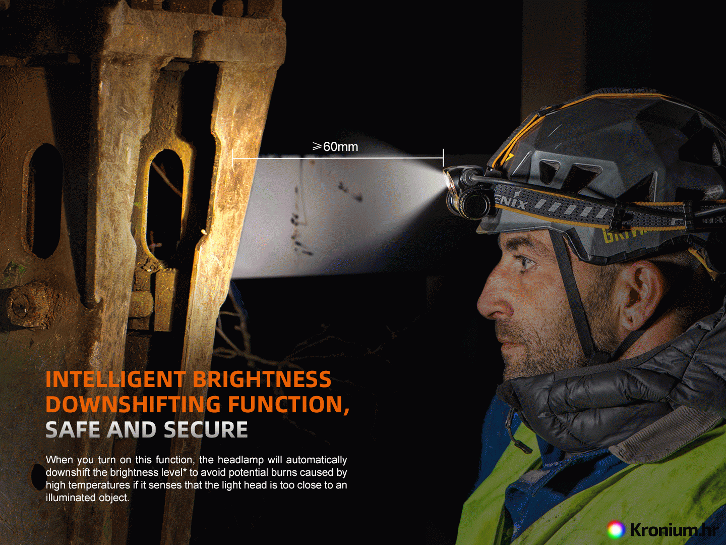 Inteligentno smanjenje snage, senzor blizine – Prednje svjetlo ima ugrađen zaštitni krug. Kada se reflektor približi osvijetljenom objektu (manje od 60 mm) na dulje od 1,5 sekunde, automatski smanjuje snagu na niski način kako bi spriječio oštećenje objekta jakim svjetlom ili zaslijepljenje reflektiranim svjetlom. Ako je reflektor udaljen više od 0,8 sekundi od osvijetljenog objekta, lampa će se automatski vratiti na prethodno korištenu razinu snage.