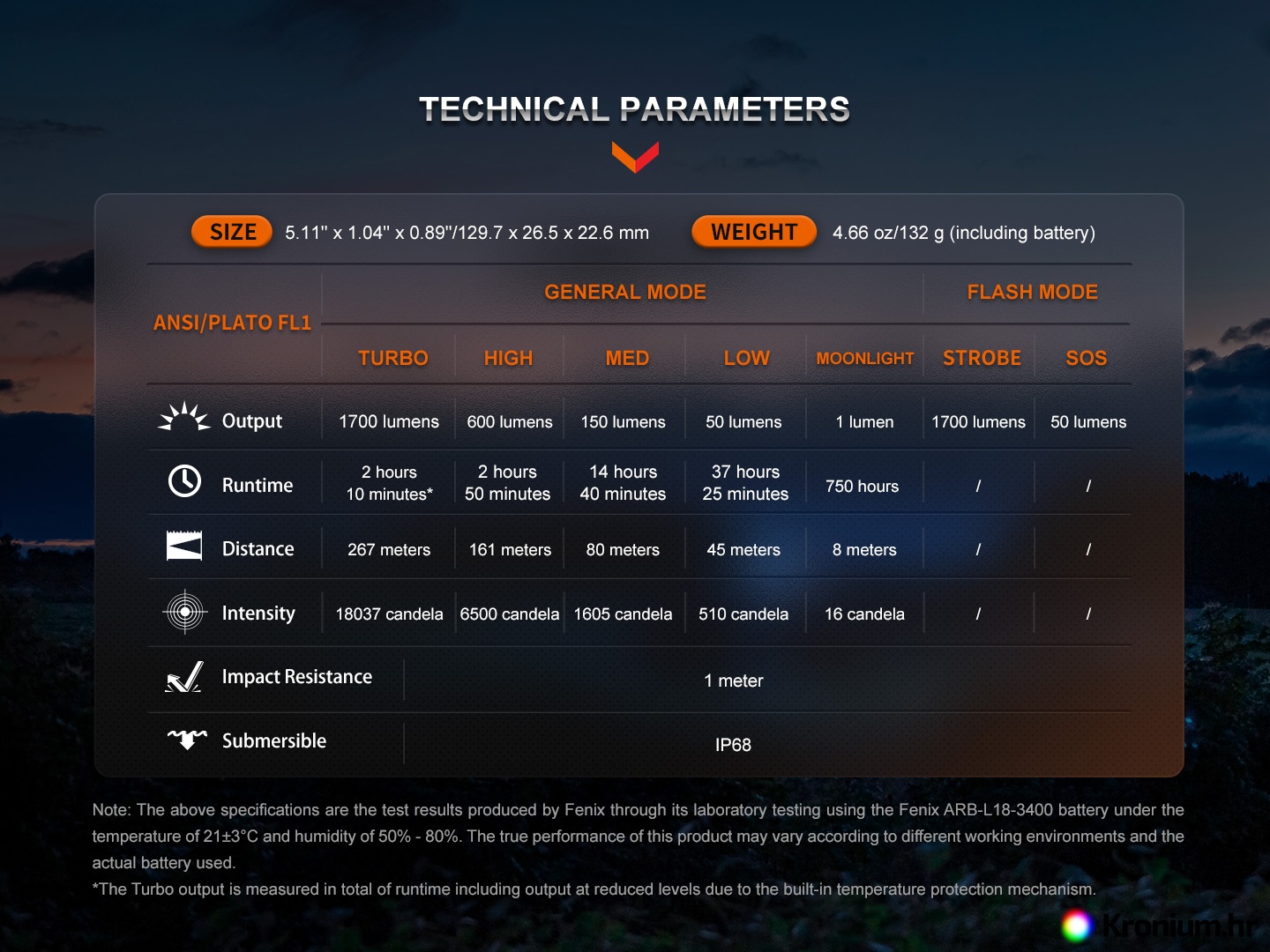 - Sedam načina osvjetljenja: 1700 lumena (2,2 sata) -> 600 lumena (2,8 sati) -> 150 lumena (14,7 sati) -> 50 lumena (37,5 sati) -> 1 lumen (750 sati) -> SOS (50 lumena) - > Stroboskop (1700 lumena).