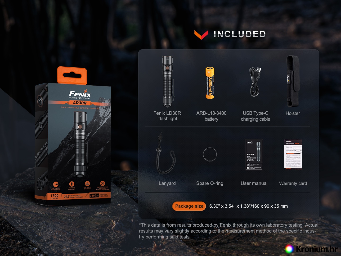 Fenix LD30R taktička svjetiljka nudi svjetlosni tok do 1700 lumena (ANSI) i sjaj do 267 metara. Među najsnažnijim je Fenix svjetiljkama s jednom 18650 Li-ion baterijom koja se puni preko USB-C priključka direktno na tijelu svjetiljke bez potrebe za vađenjem. Međutim, u slučaju nužde svjetiljka se također može napajati s dvije jednokratne CR123A baterije. Svjetiljka LD30R ima sedam različitih načina osvjetljenja, koji vam omogućuju odabir između velike snage i dugog trajanja (do 31 dan osvjetljenja odjednom), tu su i stroboskopski bljeskovi i SOS način rada za hitne situacije. Svjetiljka je opremljena indikatorom napunjenosti baterije na bočnom gumbu. Zahvaljujući taktičkom krajnjem prekidaču, prikladan je ne samo za profesionalce, već i za širok raspon vanjskih, sportskih i radnih aktivnosti.