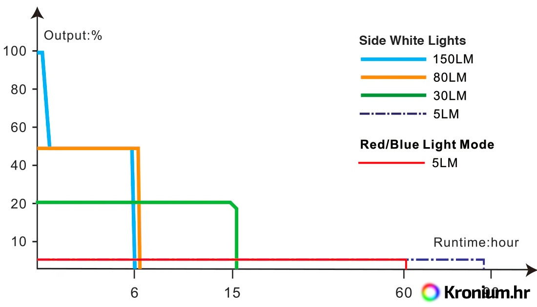 - Pet načina rada bočnog svjetla u boji: 15 lumena SOS crveno (51,1 sat) -> 15 lumena treptanje crveno i plavo (31,5 sati) -> 15 lumena treptanje plavo (30,5 sati) -> 15 lumena treptanje crveno (55,2 sata) -> 5 lumena stalno crveno svjetlo (60,6 sati).