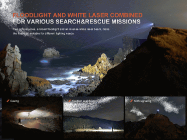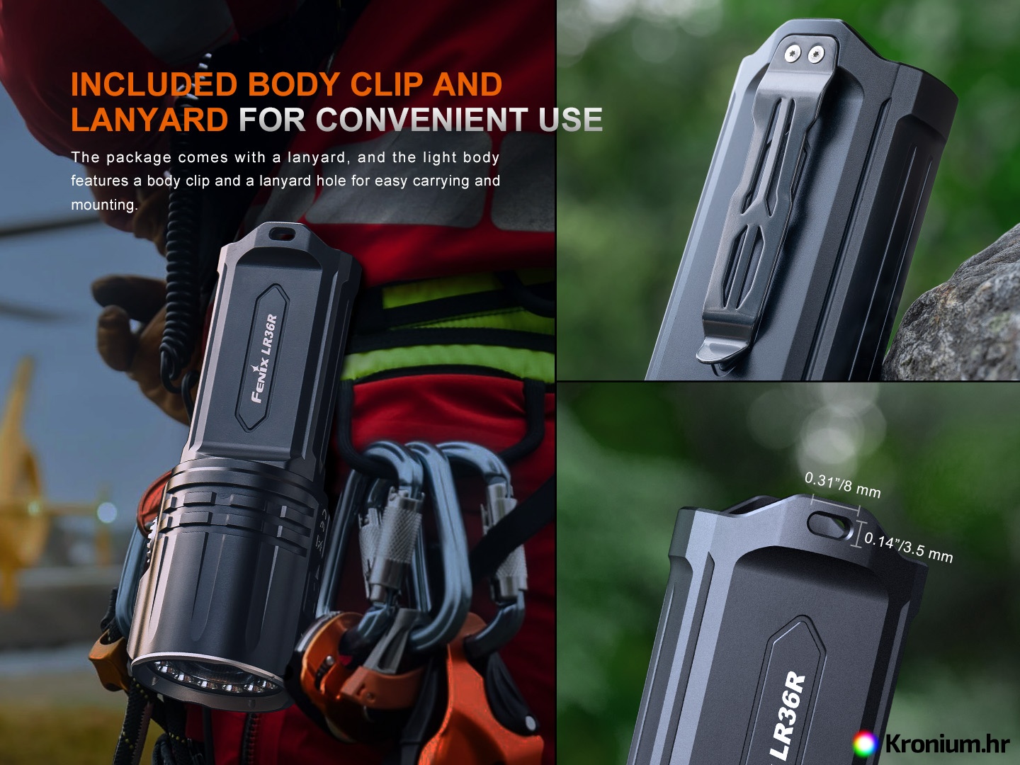 Punjiva laserska svjetiljka Fenix LR36R pruža ekstremnu snagu lumena do 10 000 lumena (ANSI) i domet do 1260 metara. Bijeli reflektor laserskog svjetla proizvodi iznimno fokusiranu zraku s dugim dometom. Izvor svjetlosti je bijeli laser s LEP (laser excited phosphor) tehnologijom, koja je poznata po svojoj upotrebi posebno u automobilskoj industriji u najluksuznijim automobilima. Reflektor s raspršenom svjetlošću sastoji se od dvanaest SST-25 LED dioda. Reflektori se mogu aktivirati istovremeno. Svjetiljku napajaju dvije Li-ion baterije tipa 21700 (uključene) koje se mogu puniti izravno u svjetiljci preko modernog USB-C konektora. Intenzitet svjetla se može kontinuirano mijenjati jednostavno jednom rukom putem okretne kontrole oko prekidača, koja se također može koristiti za zaključavanje svjetiljke. Informacije o tijeku punjenja, statusu baterije i trenutnoj snazi jasno su prikazane na OLED zaslonu. Zahvaljujući rasporedu baterija jedna uz drugu, svjetiljka je iznenađujuće kratka i savršeno leži u ruci. Svjetiljka je posebno prikladna za kretanje po teškom terenu, operacije pretraživanja, nadzor, zaštitu objekata i svugdje gdje je potrebno snažno osvijetliti velika područja. Zbog činjenice da je ovo svjetiljka s laserskim izvorom klasificirana kao kategorija 3B, može se kupiti samo uz ID tvrtke.