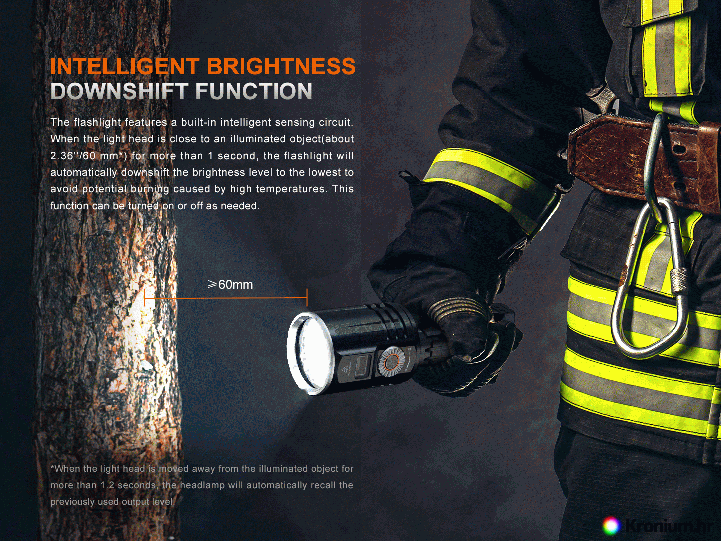 Inteligentna zaštita od pregrijavanja - Kada svjetiljku koristite u načinima rada velike snage dulje vrijeme, akumulira se velika količina topline. Kada svjetiljka dosegne temperaturu od 55°C ili višu, automatski će smanjiti snagu za nekoliko lumena kako bi se smanjila temperatura. Kada temperatura padne ispod 55 °C, izlaz će se ponovno postupno povećati.