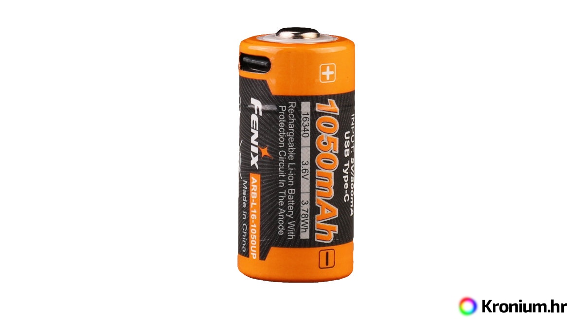 Fenix ARB-L16-1050UP je vrhunska punjiva Li-ion baterija veličine RCR123A (16340) s ogromnim kapacitetom od 1050 mAh i vlastitim USB-C priključkom za punjenje.