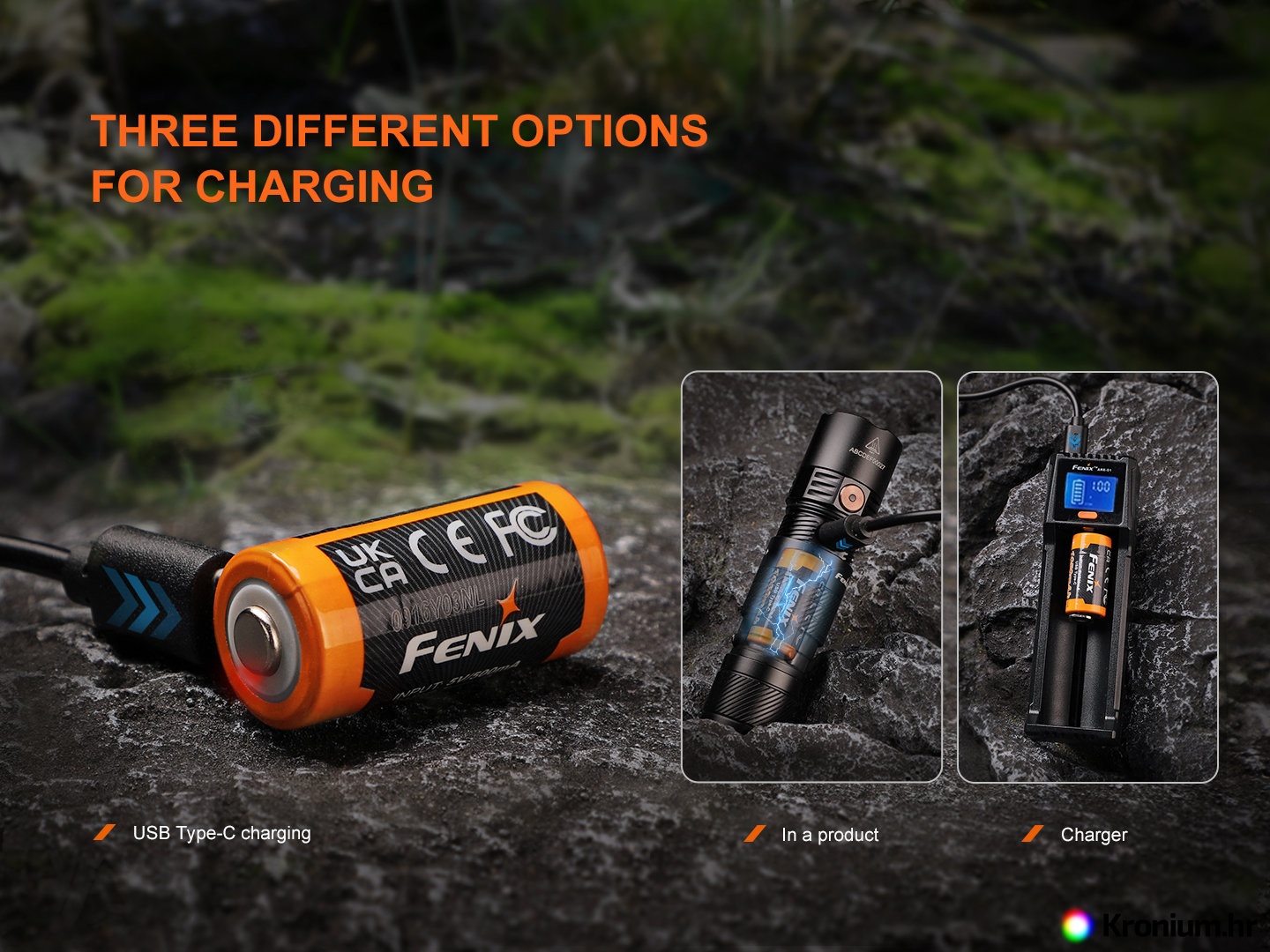 Glavna prednost je univerzalnost punjenja. Bateriju možete puniti spajanjem kabela izravno u njezin USB-C priključak (npr. punjačem za mobitel ili s računala), u klasičnom vanjskom punjaču ili izravno u punjivim svjetiljkama. Idealno je rješenje posebno za modele koji nemaju vlastiti priključak za punjenje, primjerice Fenix GL06, Fenix GL07 ili Fenix GL22. Odlično će poslužiti i kao rezervni akumulator za svjetiljke Fenix E18R V2.0, Fenix HM50R V2.0, Fenix HM51R V3.0, Fenix Vitae ili Fenix PD25R. Zahvaljujući modernoj Li-ion tehnologiji, nema memorijskog efekta i ima minimalno samopražnjenje, stoga je uvijek spremna za uporabu.