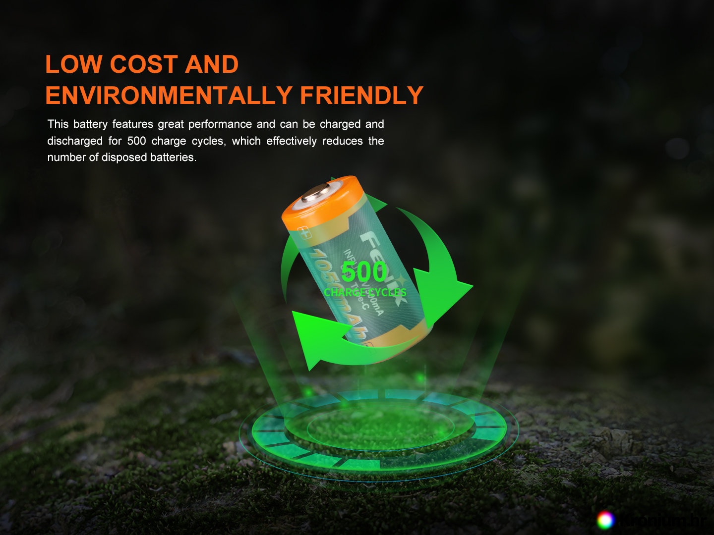 Veličinom odgovara standardu RCR123A i služi kao punjiva alternativa jednokratnim CR123A baterijama. Prije kupnje provjerite kompatibilnost: ovaj akumulator ima viši nazivni napon (3,6 V) u usporedbi s jednokratnim baterijama (3 V).