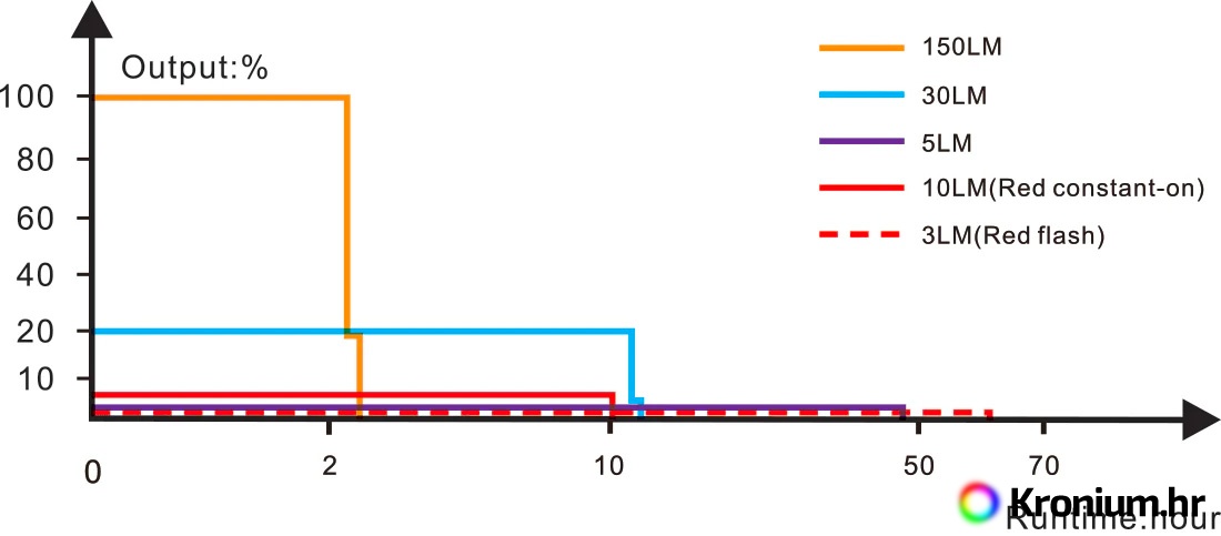 - Tri načina bijelog svjetla: 150 lumena (2,5 sata)-> 30 lumena (12,3 sata)-> 5 lumena (49 sati).