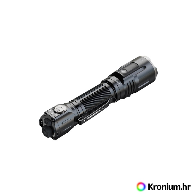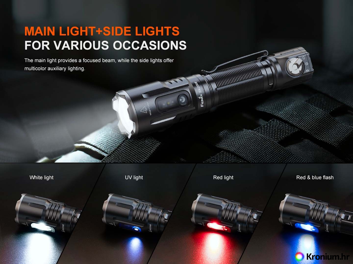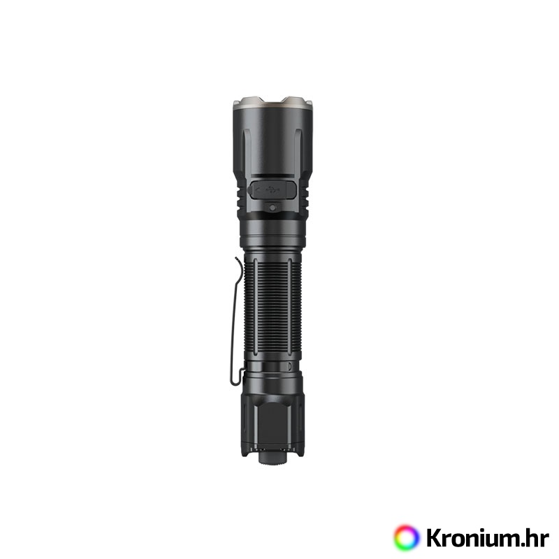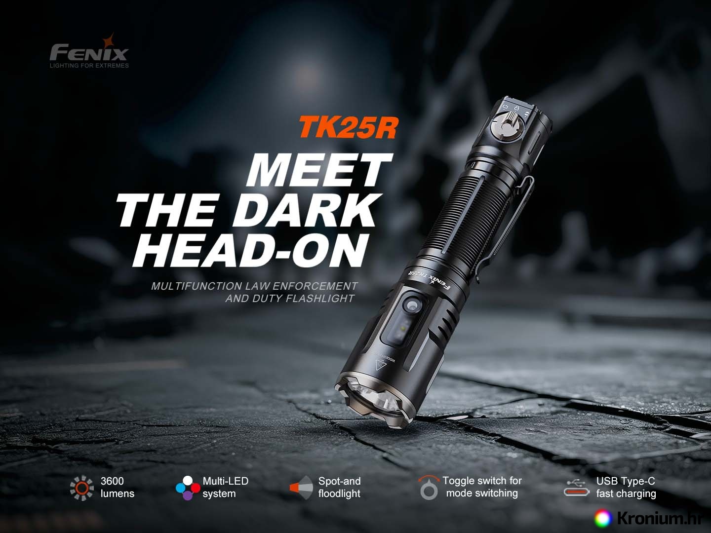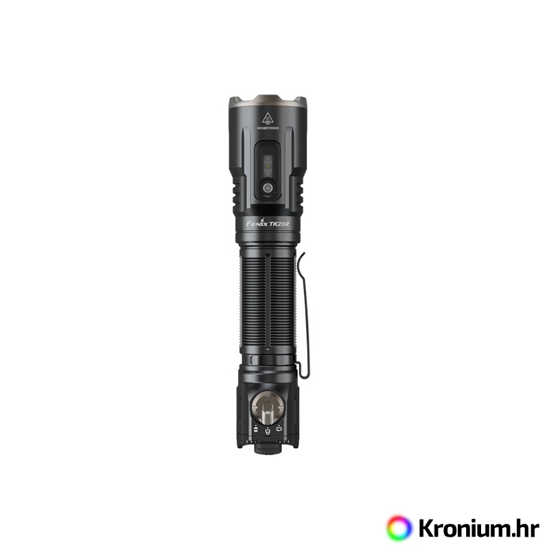 Fenix TK25R je vrhunska taktička svjetiljka koja nudi visoke performanse i univerzalnu upotrebu zahvaljujući kombinaciji glavnog i bočnog reflektora. Glavni reflektor s premium LED Cree XHP50.3 pruža svjetlosni tok do 3600 lumena s domerom snopa od 350 metara. Jedinstvena značajka ovog modela je integrirano bočno svjetlo, koje raspolaže difuznim bijelim, crvenim i ultraljubičastim svjetlom (365 nm) snage do 700 mW, što omogućuje primjerice brzu provjeru autentičnosti dokumenata i novčanica, stvrdnjavanje ljepila ili provjeru curenja tekućina. Nadalje, bočno svjetlo opremljeno je funkcijom crveno-plavog treperenja, što će posebno cijeniti oružane snage. Napajanje osigurava Li-ion baterija tipa 21700 (Fenix ARB-L21-5000 V2.0) kapaciteta 5000 mAh, koja se puni putem modernog USB-C priključka izravno na tijelu svjetiljke. Tijelo je izrađeno od izdržljive aluminijske legure A6061-T6 s tvrdom anodizacijom i potpuno je vodootporno i otporno na prašinu prema standardu IP68.