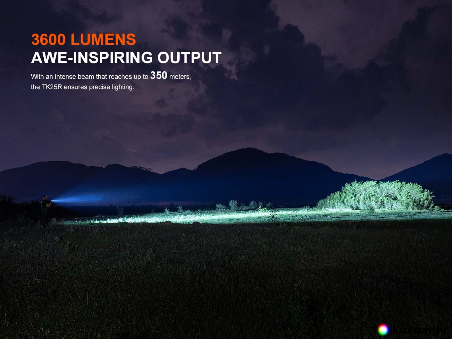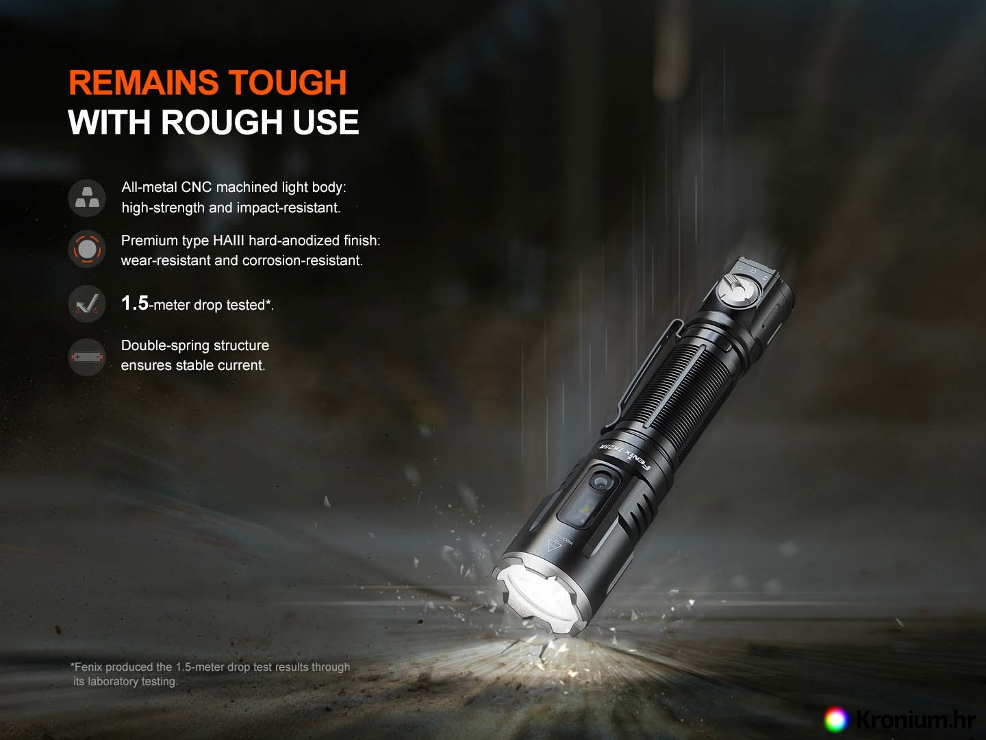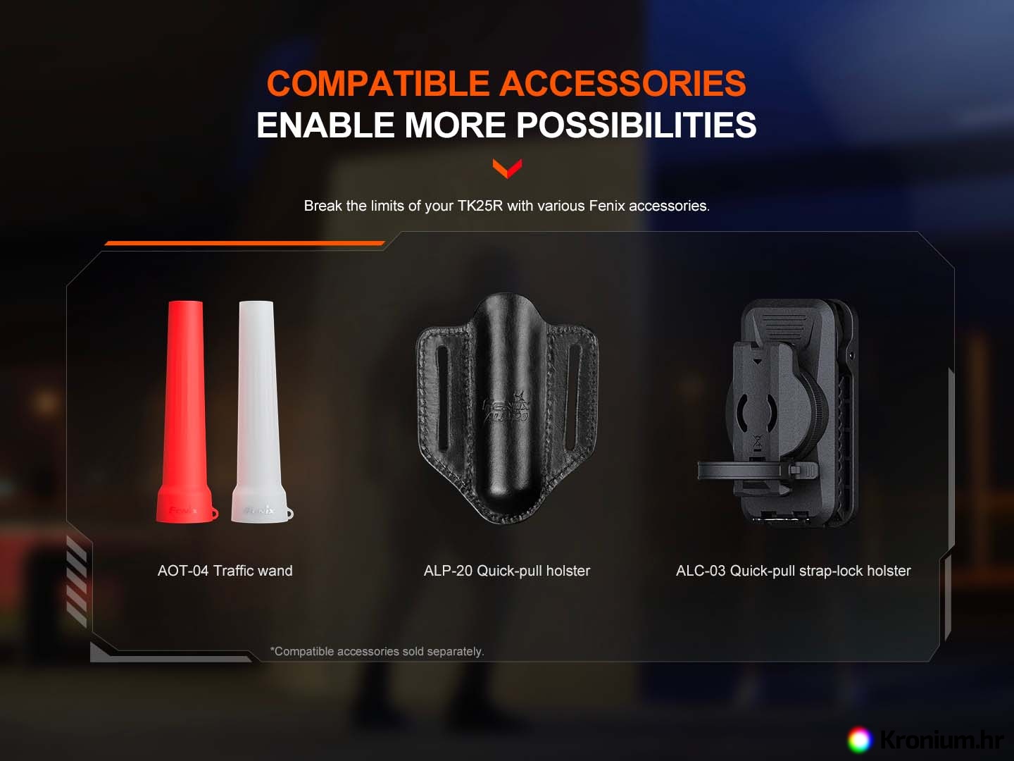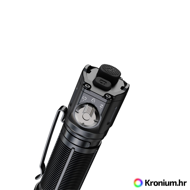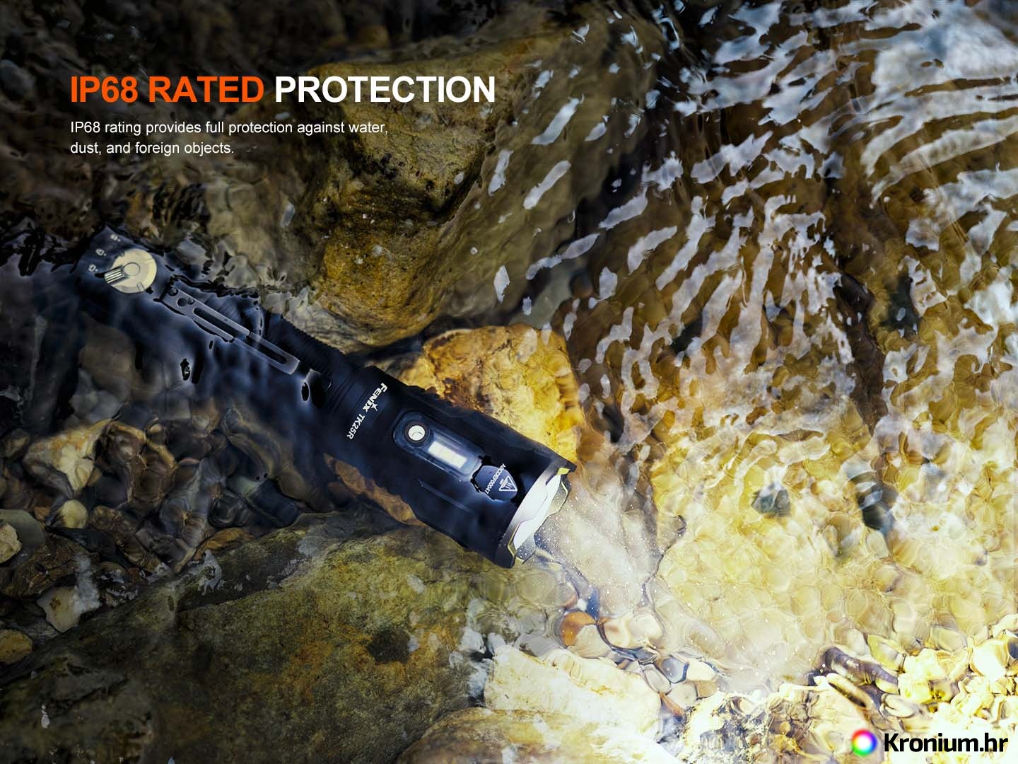 Fenix TK25R je vrhunska taktička svjetiljka koja nudi visoke performanse i univerzalnu upotrebu zahvaljujući kombinaciji glavnog i bočnog reflektora. Glavni reflektor s premium LED Cree XHP50.3 pruža svjetlosni tok do 3600 lumena s domerom snopa od 350 metara. Jedinstvena značajka ovog modela je integrirano bočno svjetlo, koje raspolaže difuznim bijelim, crvenim i ultraljubičastim svjetlom (365 nm) snage do 700 mW, što omogućuje primjerice brzu provjeru autentičnosti dokumenata i novčanica, stvrdnjavanje ljepila ili provjeru curenja tekućina. Nadalje, bočno svjetlo opremljeno je funkcijom crveno-plavog treperenja, što će posebno cijeniti oružane snage. Napajanje osigurava Li-ion baterija tipa 21700 (Fenix ARB-L21-5000 V2.0) kapaciteta 5000 mAh, koja se puni putem modernog USB-C priključka izravno na tijelu svjetiljke. Tijelo je izrađeno od izdržljive aluminijske legure A6061-T6 s tvrdom anodizacijom i potpuno je vodootporno i otporno na prašinu prema standardu IP68.