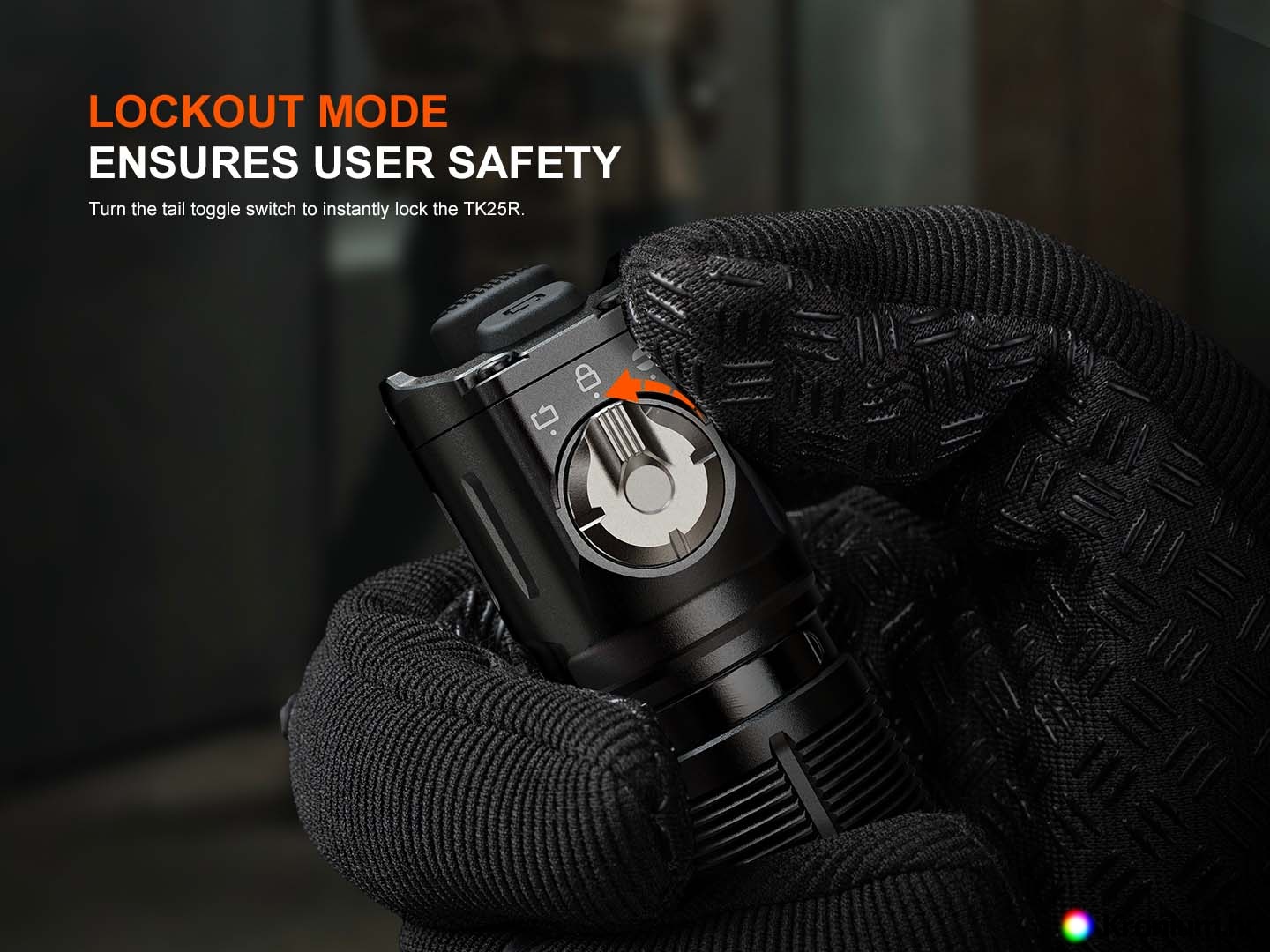Fenix TK25R nudi ukupno pet načina rada glavnog reflektora uključujući zasljepljujući stroboskop i šest načina rada bočnog svjetla (uključujući crveno svjetlo za očuvanje noćnog vida). Za upravljanje služi taktički dvostruki prekidač na kraju, koji omogućuje trenutno uključivanje, brzo pokretanje turbo načina i trenutnu aktivaciju stroboskopa. Ova ergonomija je idealna za krizne situacije kada je svjetlo potrebno koristiti brzo i bez traženja gumba.