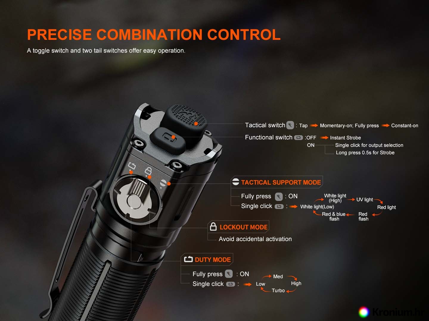 Za uključivanje pritisnite glavni taktički prekidač na kraju svjetiljke, za trenutnu aktivaciju ga lagano pritisnite. Pritiskom na sporedni gumb za prebacivanje možete zatim ciklički mijenjati načine osvjetljenja odabranog reflektora. Turbo način od 3600 lumena može se također bilo kada izravno aktivirati držanjem glavnog taktičkog gumba tijekom 0,5 sekundi. Za prelazak u stroboskop dok je svjetiljka uključena, držite gumb za prebacivanje 0,5 sekundi. Za uključivanje svjetiljke izravno u stroboskopski način pritisnite i držite gumb za prebacivanje.