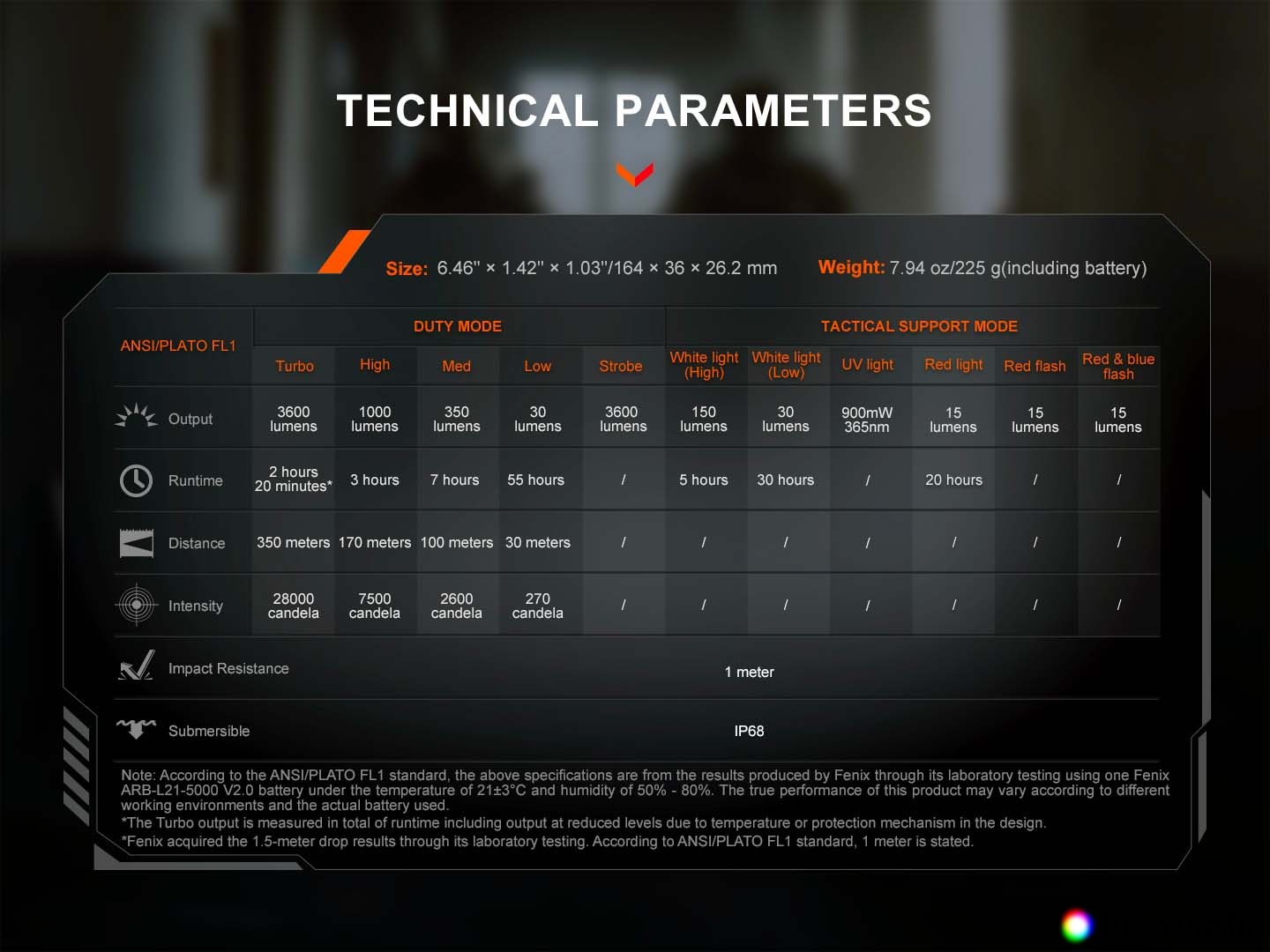 Svi parametri svjetiljke (svjetlosni tok, vrijeme rada na baterije, vodootpornost, domet i otpornost na udarce) izmjereni su u skladu s normom ANSI/NEMA FL 1-2009.
