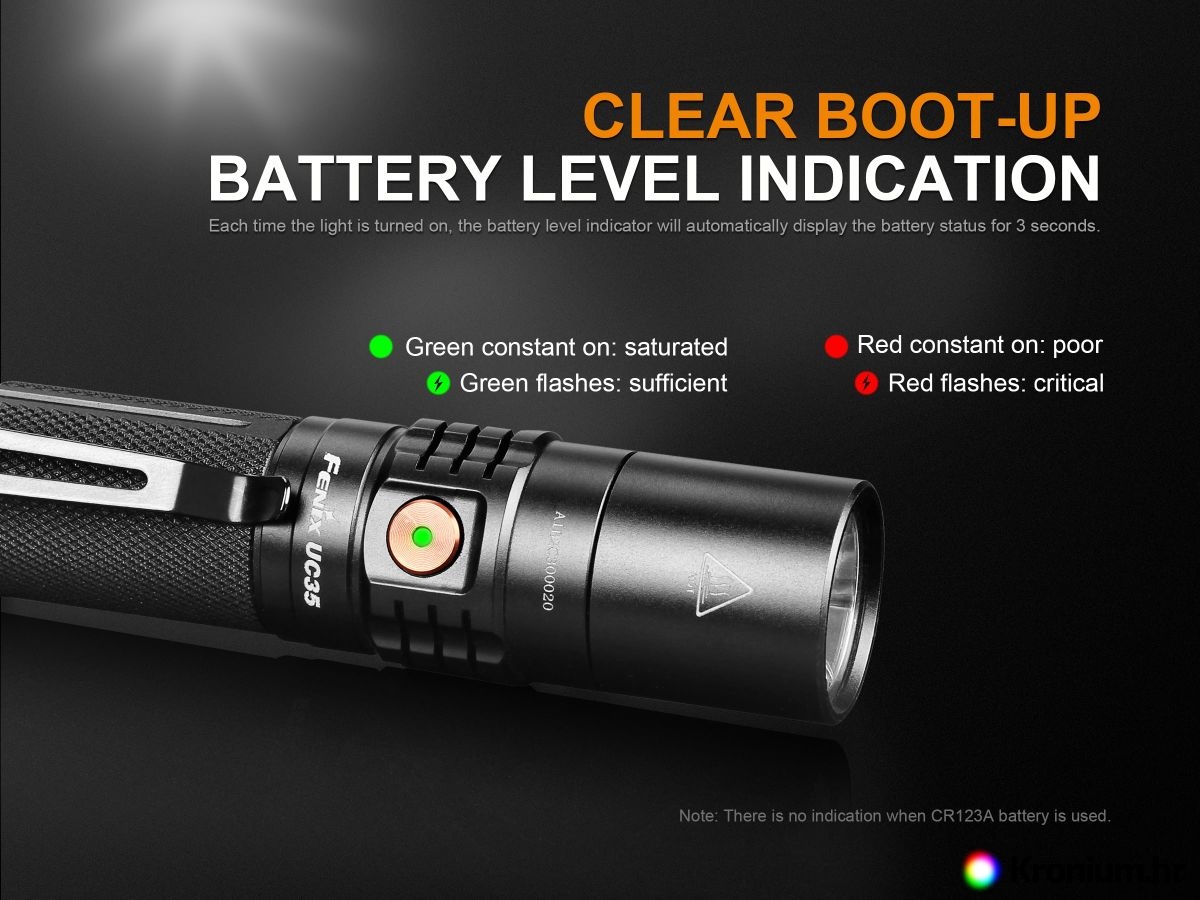 Baterijska svjetiljka se napaja digitalno reguliranom konstantnom strujom kako bi se zajamčio konstantan izlaz svjetla čak i kada je napon u baterijama smanjen (dok se polako prazne). Osim toga, svjetiljka je opremljena indikatorom stanja napunjenosti baterije na bočnom gumbu. Druga generacija svjetiljke Fenix UC35 V2.0 impresionira ne samo manjim dimenzijama i produženim naknadnim sjajem, već i taktičkim prekidačem i mogućnošću pričvršćivanja kabelskog prekidača AER-02. Stoga ga možemo preporučiti i za korištenje u sigurnosnim komponentama, za lov i druge zahtjevne aktivnosti.