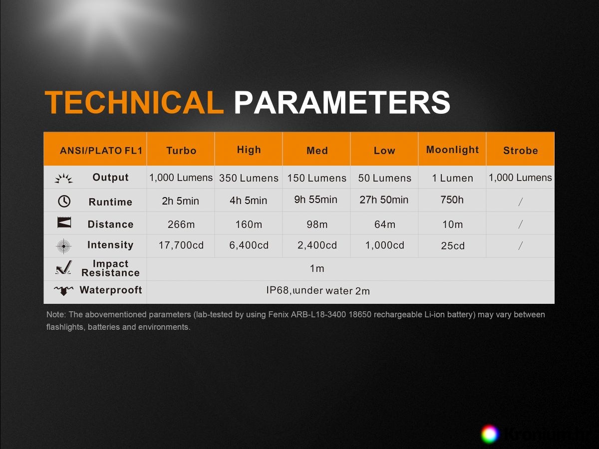 Svi parametri svjetiljke (svjetlosni tok, trajanje baterije, vodootpornost, naknadni sjaj i otpornost na udarce) izmjereni su u skladu sa standardom ANSI/NEMA FL 1-2009.