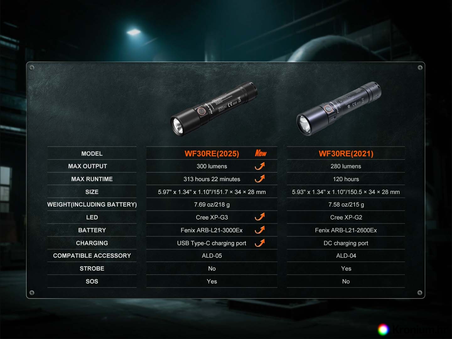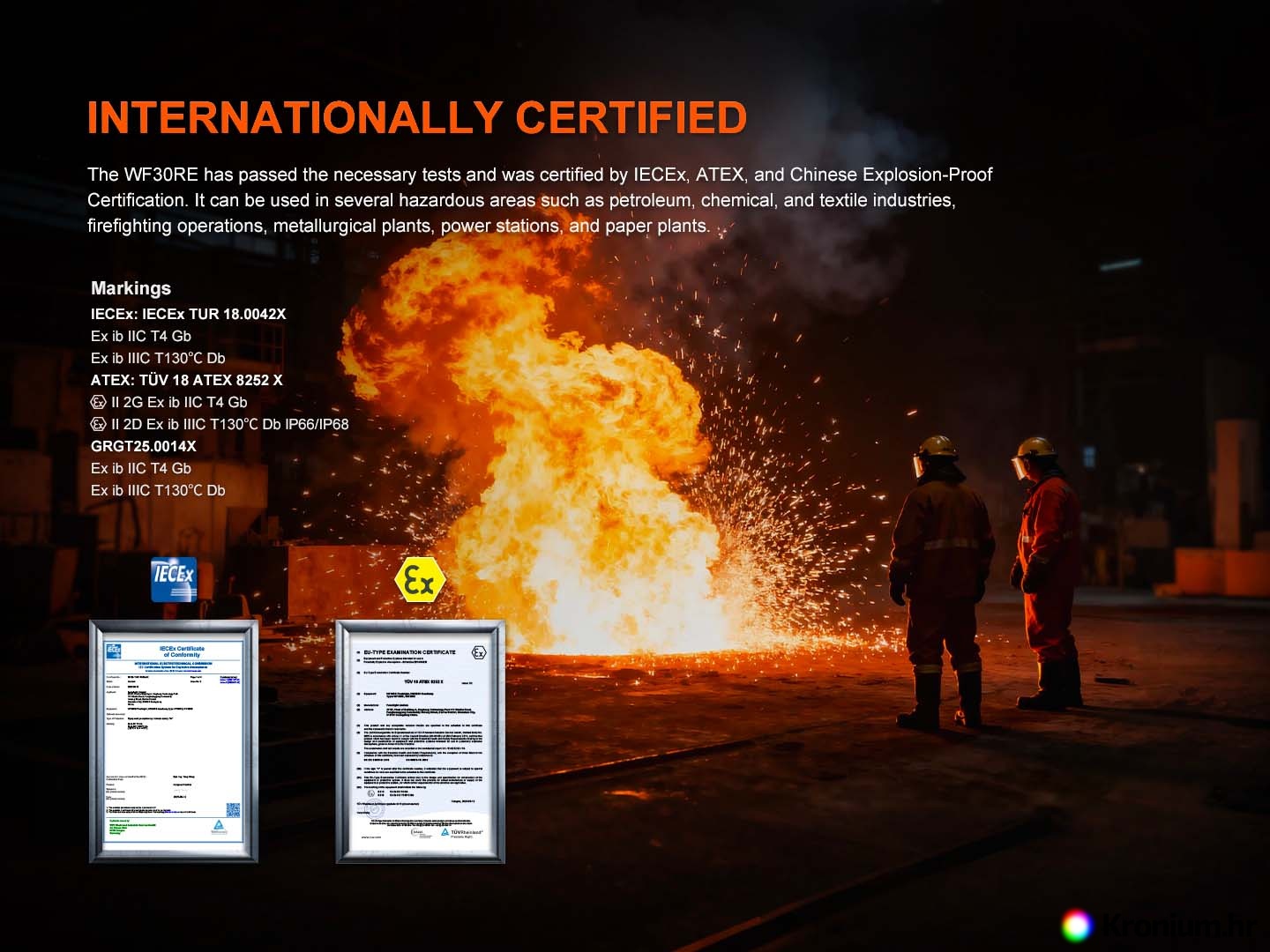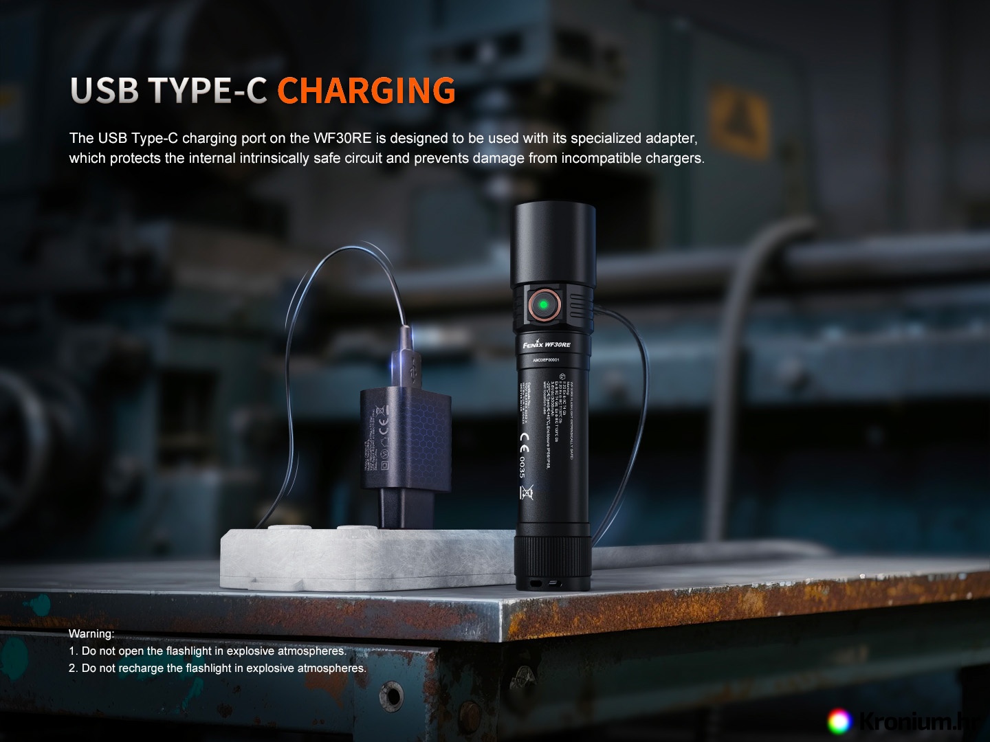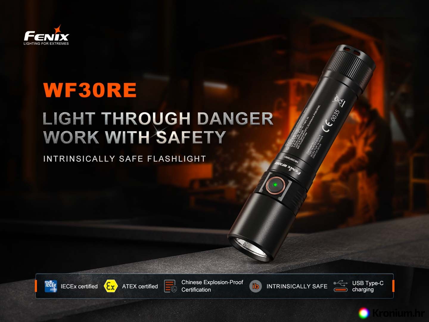 Profesionalna punjiva svjetiljka Fenix WF30RE opremljena je ATEX/IECex certifikatom za uporabu u eksplozivnom okruženju. Svjetiljku napaja posebno prilagođena Li-ion baterija ARB-L21-3000Ex kapaciteta 3000 mAh i pruža svjetlosni tok do 300 lumena s dometom do 149 metara. Baterija se puni izravno u svjetiljci putem USB-C priključka. Tijelo svjetiljke izrađeno je od zrakoplovnog aluminija visoke izdržljivosti i otpornosti na udarce. Svjetiljka je namijenjena posebno vatrogascima i spasiocima, a pogodna je i kao radna svjetiljka u industrijskim postrojenjima s mogućnošću pojave eksplozivnih prašina i plinova. To uključuje, na primjer, kemijska postrojenja, rafinerije, tvornice tekstila, tvornice papira, mlinove, metalurška postrojenja, elektrane i druga postrojenja.