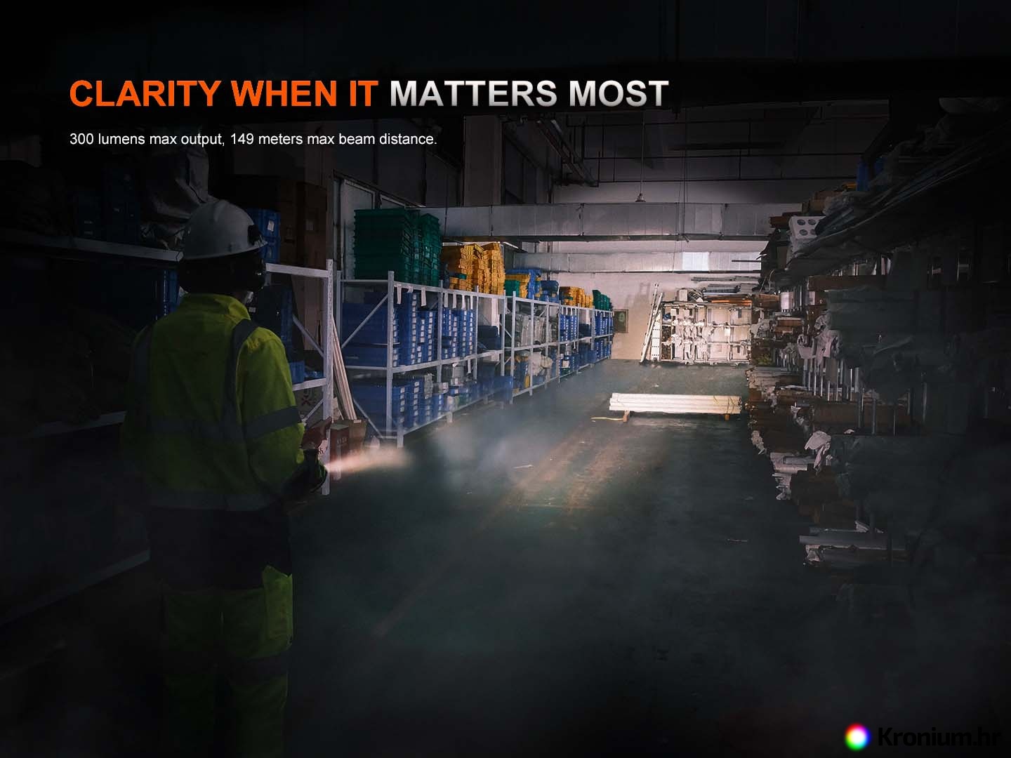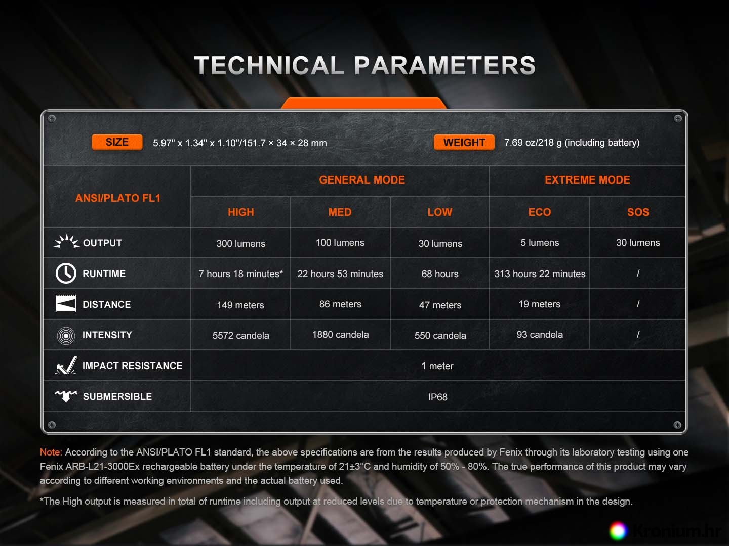 - Pet načina rada: 300 lumena (7,3 sata) -> 100 lumena (22,8 sati) -> 30 lumena (68 sati) -> 5 lumena (313,3 sata) -> SOS (30 lumena).