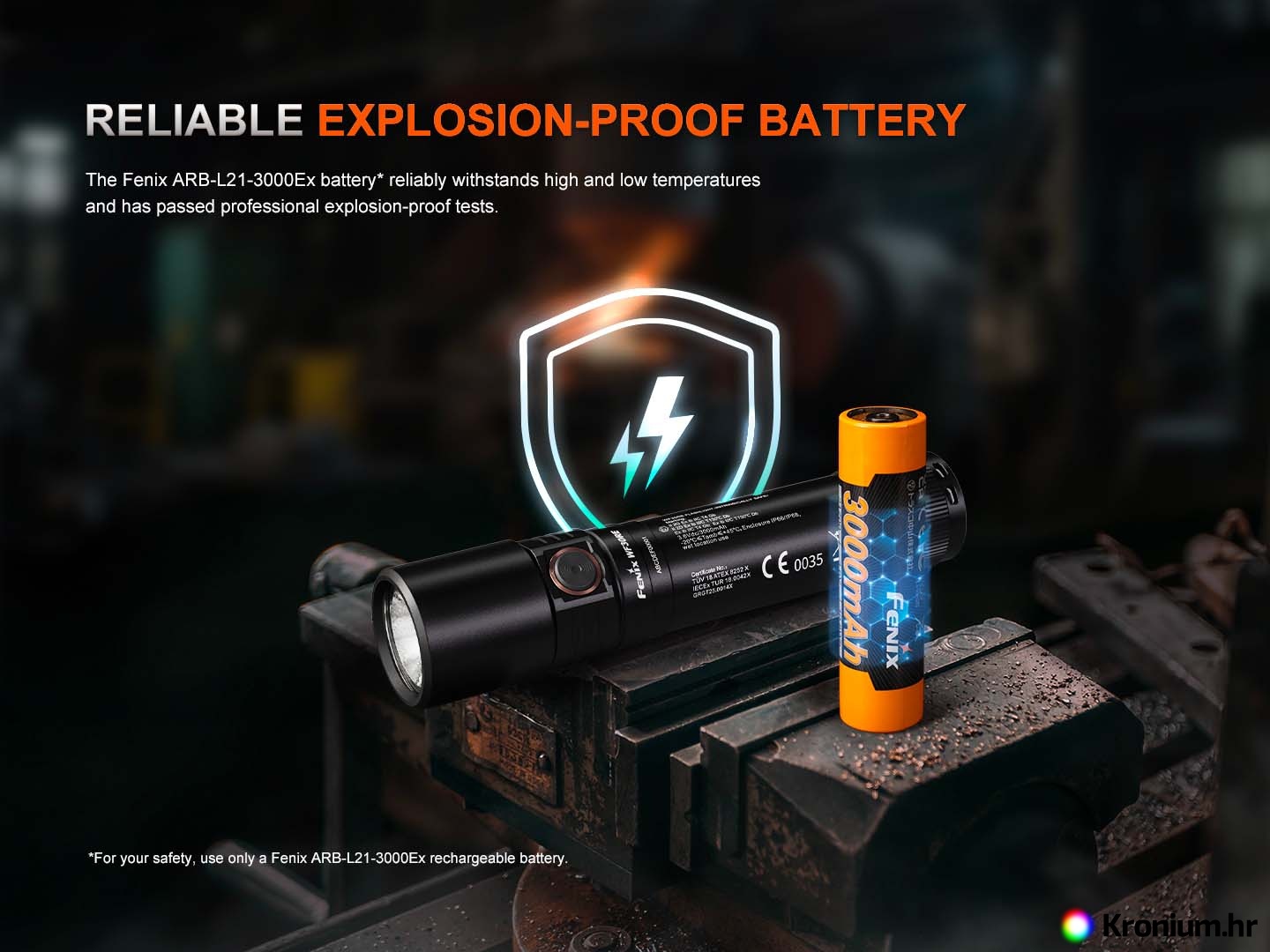 - Koristi specijalnu Li-ion bateriju Fenix ARB-L21-3000Ex kapaciteta 3000 mAh. Riječ je o prilagođenom tipu certificiranom za eksplozivna okruženja.