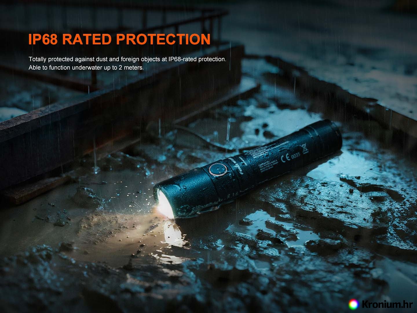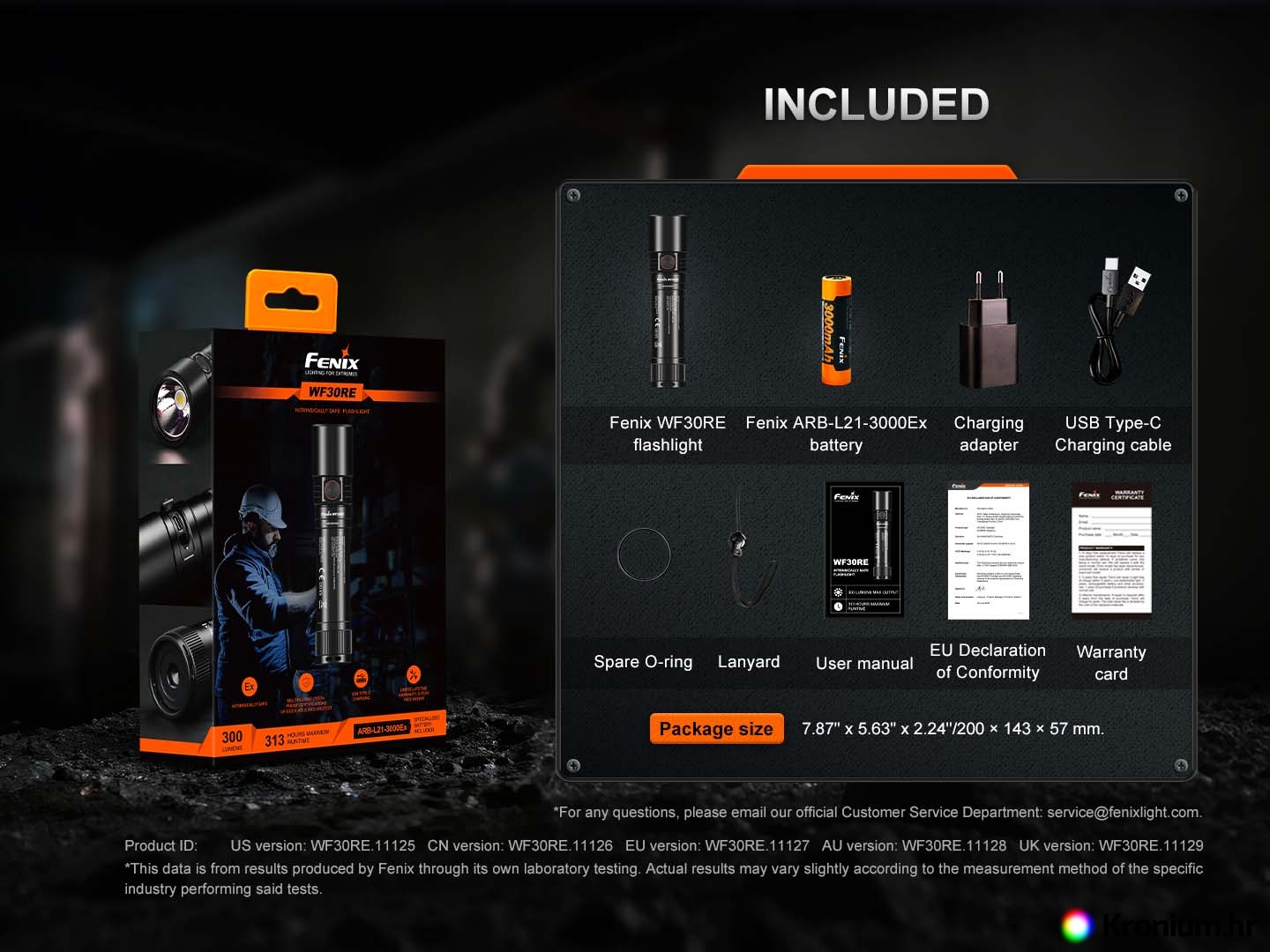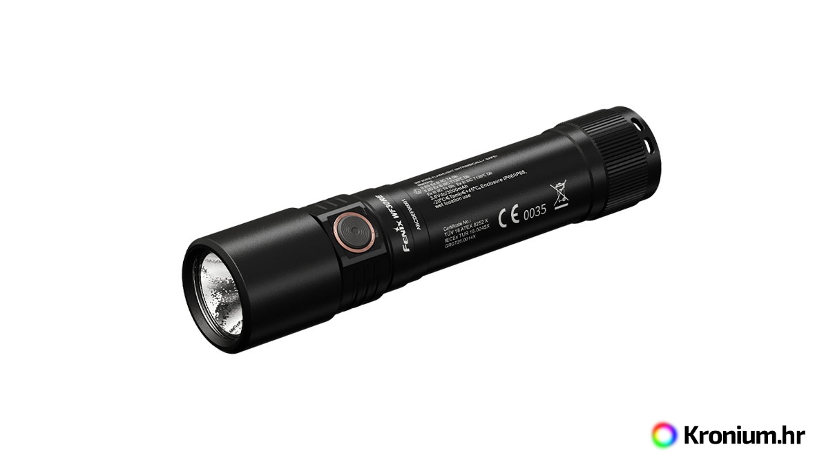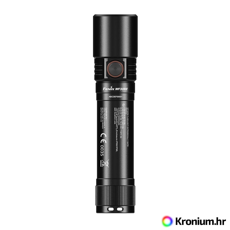 - Paket uključuje: Svjetiljku Fenix WF30RE, bateriju Fenix ARB-L21-3000Ex, USB adapter za punjenje, USB-C kabel za punjenje, EU Izjavu o sukladnosti, zamjenski O-prsten, vezicu za ruku, korisnički priručnik, jamstveni list.