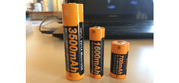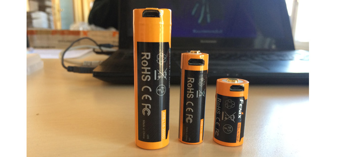 Az utóbbi idők slágere a beépített mikro-USB csatlakozós akkumulátorok, melyeket például a telefontöltő kábellel is lehet közvetlenül tölteni. Körülbelül 1 mm-rel hosszabbak, mint ugyanazok az akkumulátorok USB bemenet nélkül, mert egy USB csatlakozó és a töltést vezérlő elektronika került még bele. Az újabb lámpáknál, fejlámpáknál ez általában nem okoz gondot, mert ezek méretét már figyelembe vette a gyártó. Ha egy régebbi lámpát szeretne felszerelni velük, először alaposan meg kell mérni mindent.