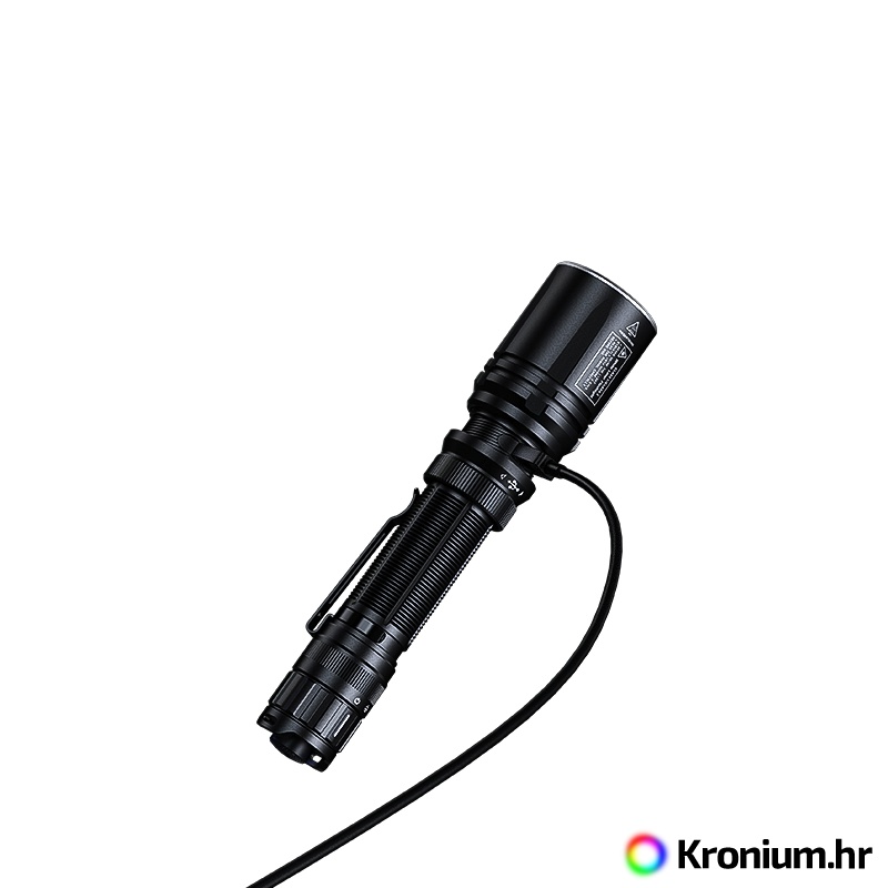 - Taktički prekidač na kraju svjetiljke (funkcija izravnog stroboskopa držanjem gumba).