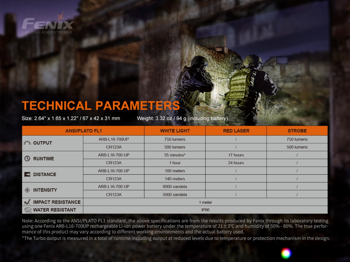 - U pakiranju je baterija Fenix ARB-L16-700UP, micro USB kabel za punjenje, imbus ključ na postavljenje smjera svjetljenja lasera, dašćica za montažu na šipku za oružje Picatinny (dašćica GLOCK je već instalirana unaprijed) i upute.