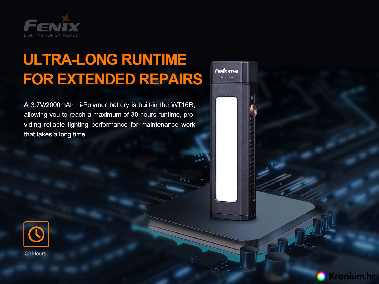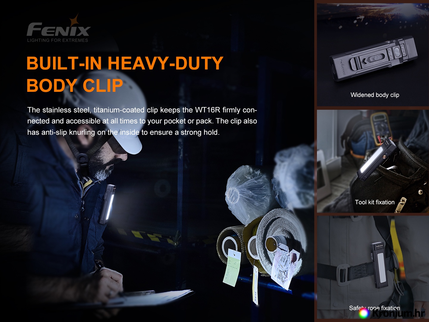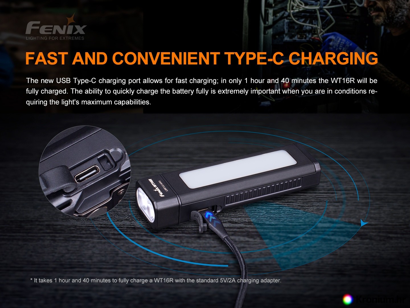 Fenix WT16R je višenamjenska svjetiljka na punjenje s daljinskim reflektorom i bočnim širokim svjetlom snage 300 lumena. Svjetlosni izvor u daljinskom reflektoru su dvije LED Cree XP-E2, bočno svjetlo sadrži nekoliko COB LED. Bočno svjetlo ima široki svjetlosni konus s ravnomjernim intenzitetom koji je idealan ne samo za osvjetljenje radnog mjesta, već ima i funkciju žutog svjetla upozorenja. Svjetiljka Fenix WT16R je opremljena i čvrstom čeličnom sponom za jednostavno nošenje na remenu ili džepu. Također je opremljena i s dva snažna magneta, jednim na boku, te drugim na donjoj strani. Svjetiljku je moguće jednostavno postaviti na metalnu površinu u dva razna položaja. Premda je svjetiljka dizajnirana specijalno za rad, savršeno će poslužiti i u kućanstvu ili kampiranju.
