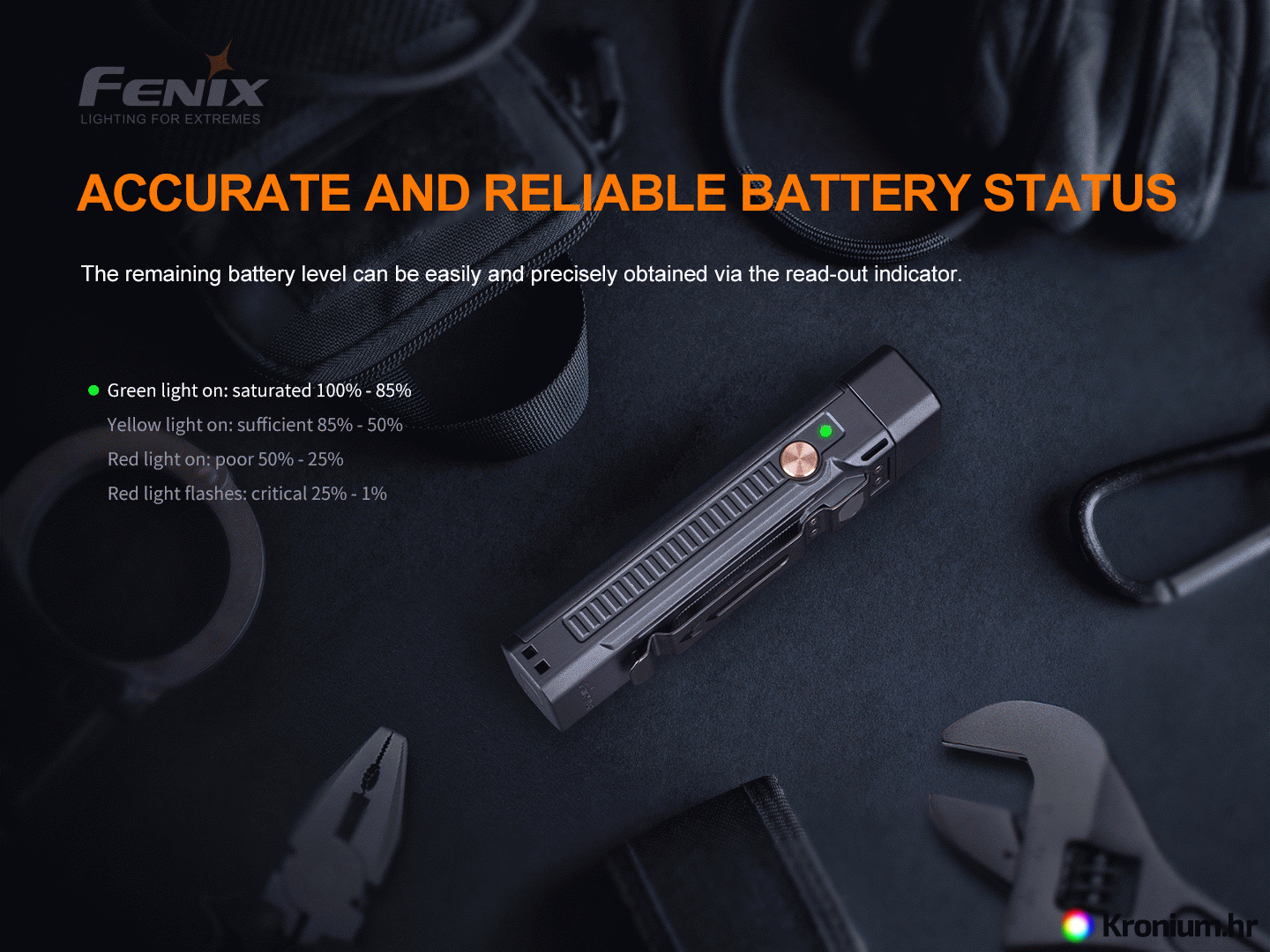 Indikacija stanja napunjenosti - Nakon kratkog pritiska gumba (svjetiljka je upaljena) aktivira se LED indikator stanja napunjenosti baterija kraj gumba. Zeleno svjetlo znači napunjenost više od 85%, zeleno treperenje 85 – 50%, crveno svjetlo 50 – 25% i crveno treperenje znači napunjenje manje od 25%.