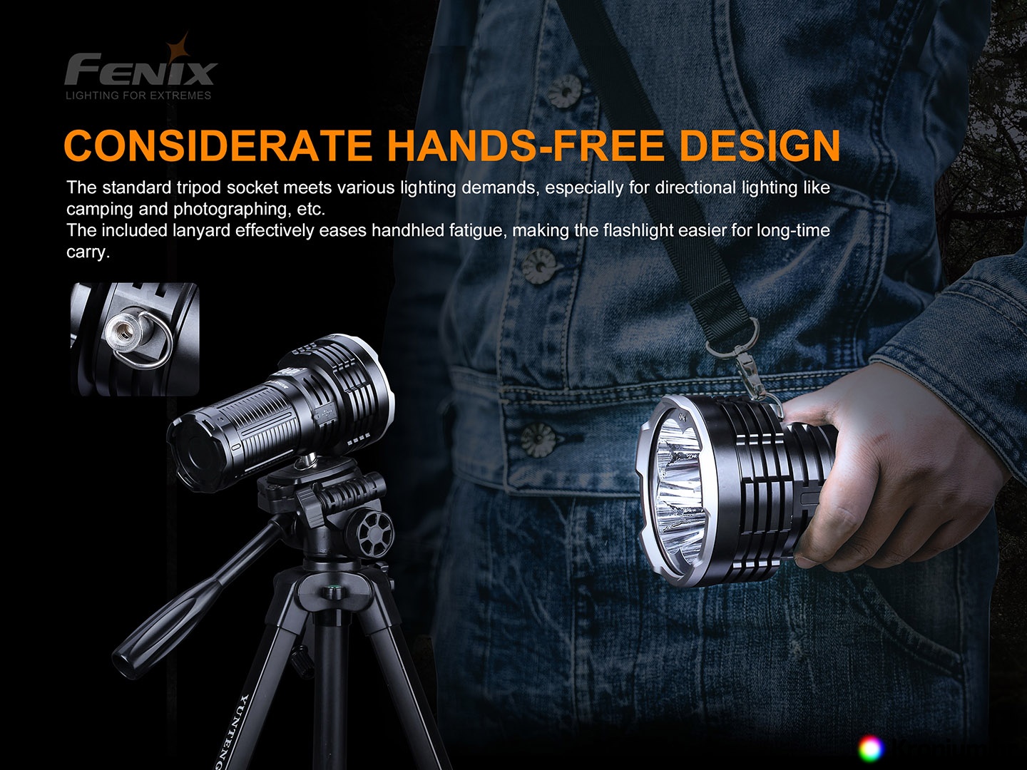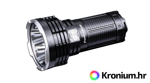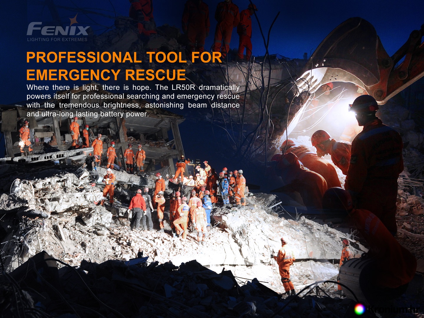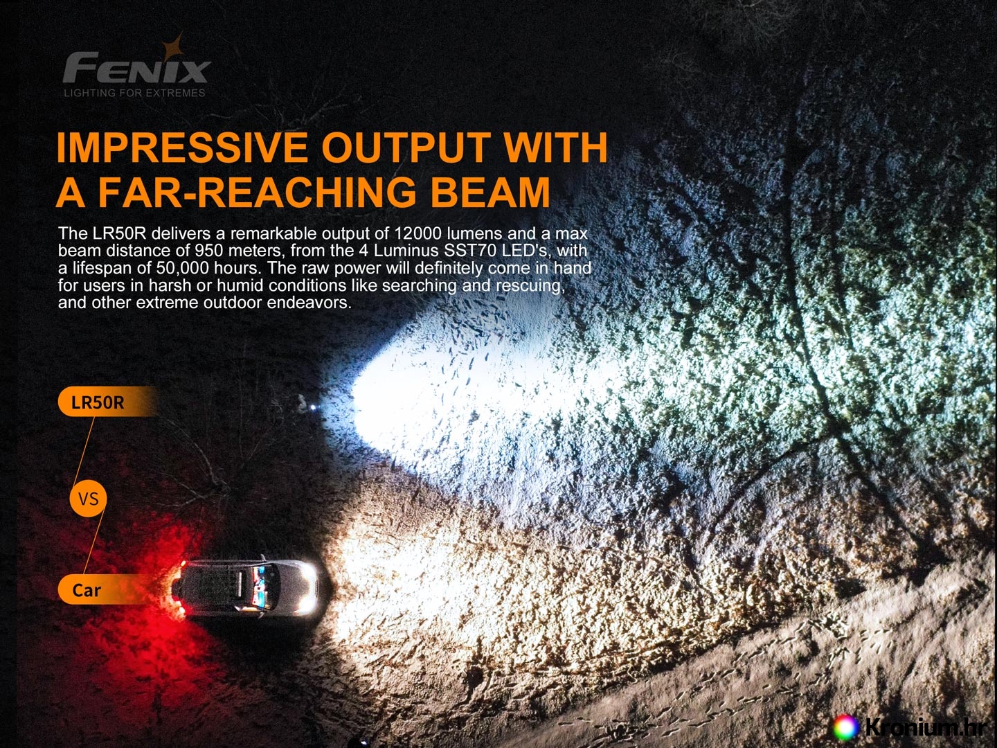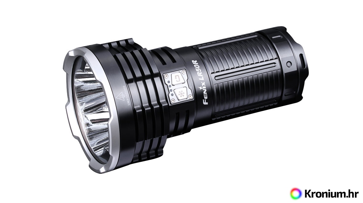 Ultra snažna LED svjetiljka na punjenje Fenix LR50R donosi ekstreman svjetlosni tok do 12.000 lumena (ANSI) i doseg do 950 metara. Snagu opterećenja doseže pomoću četiri snažna LED Luminus SST-70 s vremenom trajanja do 50.000 sati svjetlenja, uz napajanje iz internog visokostrujne Li-ion baterije, kapaciteta 57,6 Wh. Baterija se puni izravno u svjetiljki preko modernog USB-C konektora. Svjetiljka nudi upravljanje pomoću dva gumba s kojima se odvojeno preklapaju režimi svjetlenja i stroboskopski režim.