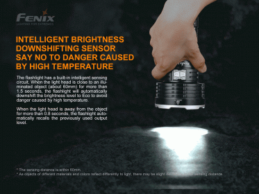 Inteligentna zaštita od pregrijavanja – nakon prekoračenja temperature od 60 °C svjetiljka automatski postepeno smanji snagu opterećenja u malim koracima na razinu 3000 lumena, nakon ohlađenja se snaga opet automatski poveća. Rad na najvišem Turbo režimu (12.000 lumena) je vremenski ograničen na 20 sekundi, nakon toga svjetiljka u roku 60 sekundi smanji opterećenje snage na 8.000 lumena. Ako je izabrana druga najviša razina (6.000 lumena) dulje od 60 sekundi, tijekom 60 sekundi snaga se smanjuje na 4.000 lumena.