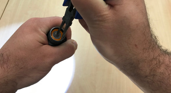 - Morate li cijelu svjetiljku odmah poslati na servis? Ukoliko ste isključili grešku u bateriji, vrijeme je da saznate da li je problem u glavi ili na kraju svjetiljke. Odvrnete poklopac i privremeno (npr. kliještima) spojite bateriju i tijelo svjetiljke gdje površina nije anodizirana. Ako svjetiljka radi, najvjerojatnije postoji greška u zadnjem dijelu svjetiljke, a ako ne radi potrebno je provjeriti glavu svjetiljke.