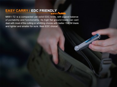 Kompaktni nož na zatvaranje Ruike M661-TZ ekskluzivna je titan verzija noža P661-B, koji se otvara jednostavno kolčićem za palac na lijevoj strani oštrice. Protiv neželjenog je zatvaranja opremljen osiguračem frame lock. Nož je opremljen sponom za zakvačenje o džep, drška je izrađena iz kombinacije legure titana TC4 s jedne strane i kompozita G10 za sigurno držanje na drugoj strani. Ovim spojem je nastao istovremeno udoban i luksuzan dodatak za svakodnevno nošenje (EDC).