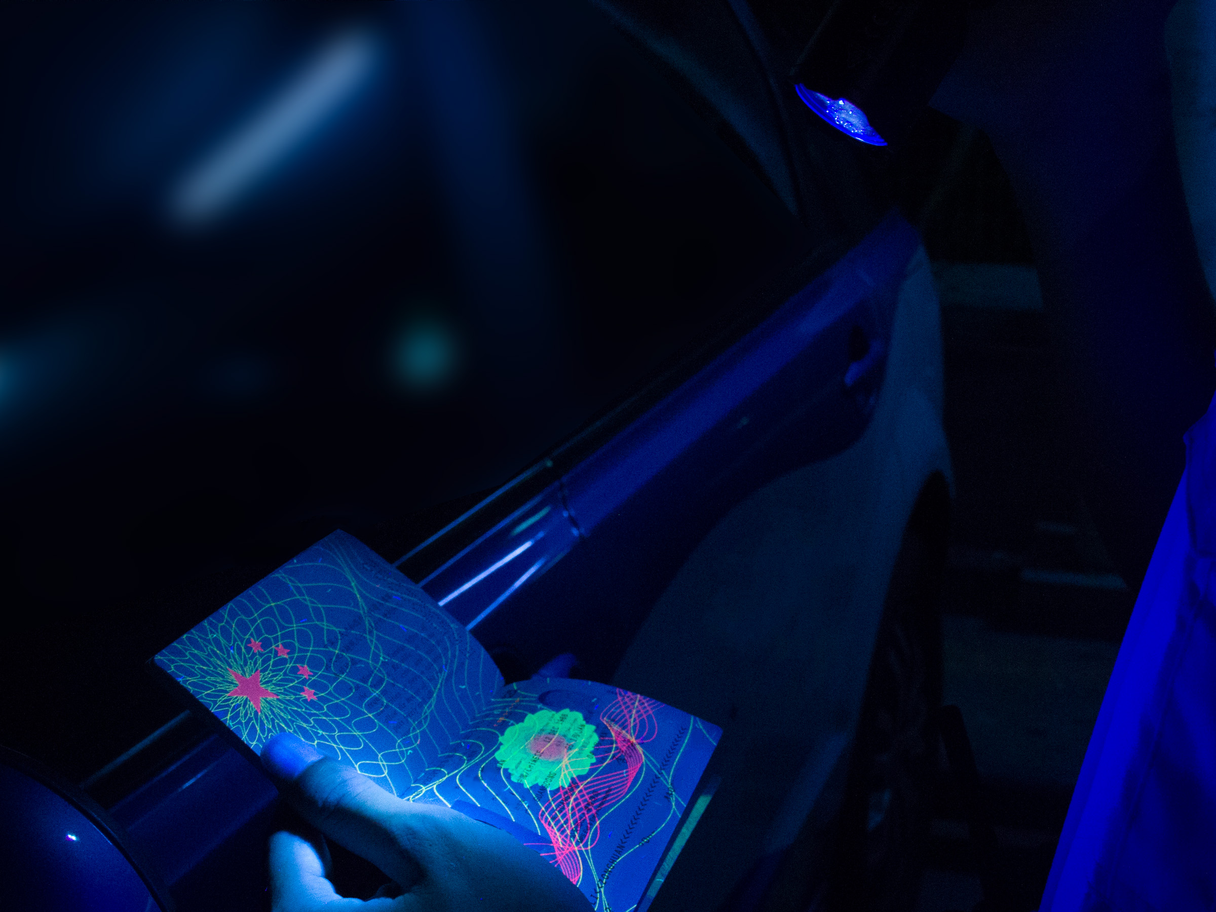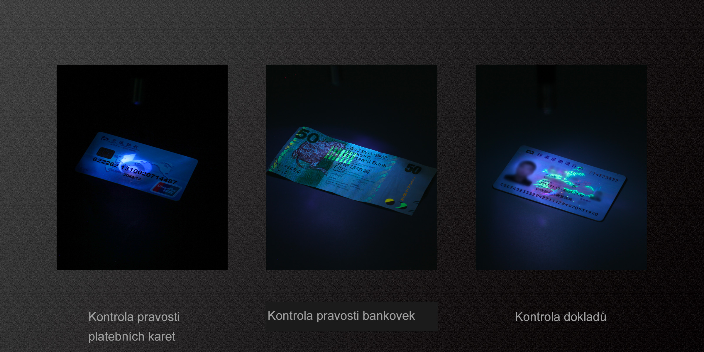 - Provjera autentičnosti: Novčanice, dokumenti, platne kartice i druge dragocjenosti imaju zaštitne elemente vidljive osobito pod UV svjetlom.